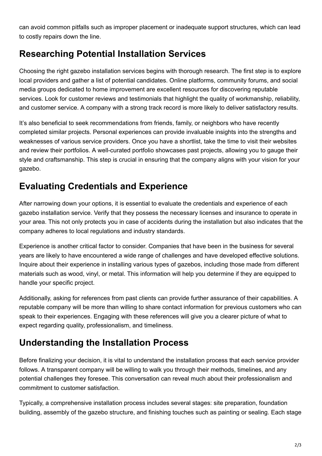 can avoid common pitfalls such as improper placement or inadequate support structures, which can lead to costly repairs down the line. Researching Potential Installation Services Choosing the right gazebo installation services begins with thorough research. The first step is to explore local providers and gather a list of potential candidates. Online platforms, community forums, and social media groups dedicated to home improvement are excellent resources for discovering reputable services. Look for customer reviews and testimonials that highlight the quality of workmanship, reliability, and customer service. A company with a strong track record is more likely to deliver satisfactory results. It’s also beneficial to seek recommendations from friends, family, or neighbors who have recently completed similar projects. Personal experiences can provide invaluable insights into the strengths and weaknesses of various service providers. Once you have a shortlist, take the time to visit their websites and review their portfolios. A well-curated portfolio showcases past projects, allowing you to gauge their style and craftsmanship. This step is crucial in ensuring that the company aligns with your vision for your gazebo. Evaluating Credentials and Experience After narrowing down your options, it is essential to evaluate the credentials and experience of each gazebo installation service. Verify that they possess the necessary licenses and insurance to operate in your area. This not only protects you in case of accidents during the installation but also indicates that the company adheres to local regulations and industry standards. Experience is another critical factor to consider. Companies that have been in the business for several years are likely to have encountered a wide range of challenges and have developed effective solutions. Inquire about their experience in installing various types of gazebos, including those made from different materials such as wood, vinyl, or metal. This information will help you determine if they are equipped to handle your specific project. Additionally, asking for references from past clients can provide further assurance of their capabilities. A reputable company will be more than willing to share contact information for previous customers who can speak to their experiences. Engaging with these references will give you a clearer picture of what to expect regarding quality, professionalism, and timeliness. Understanding the Installation Process Before finalizing your decision, it is vital to understand the installation process that each service provider follows. A transparent company will be willing to walk you through their methods, timelines, and any potential challenges they foresee. This conversation can reveal much about their professionalism and commitment to customer satisfaction. Typically, a comprehensive installation process includes several stages: site preparation, foundation building, assembly of the gazebo structure, and finishing touches such as painting or sealing. Each stage 2/3