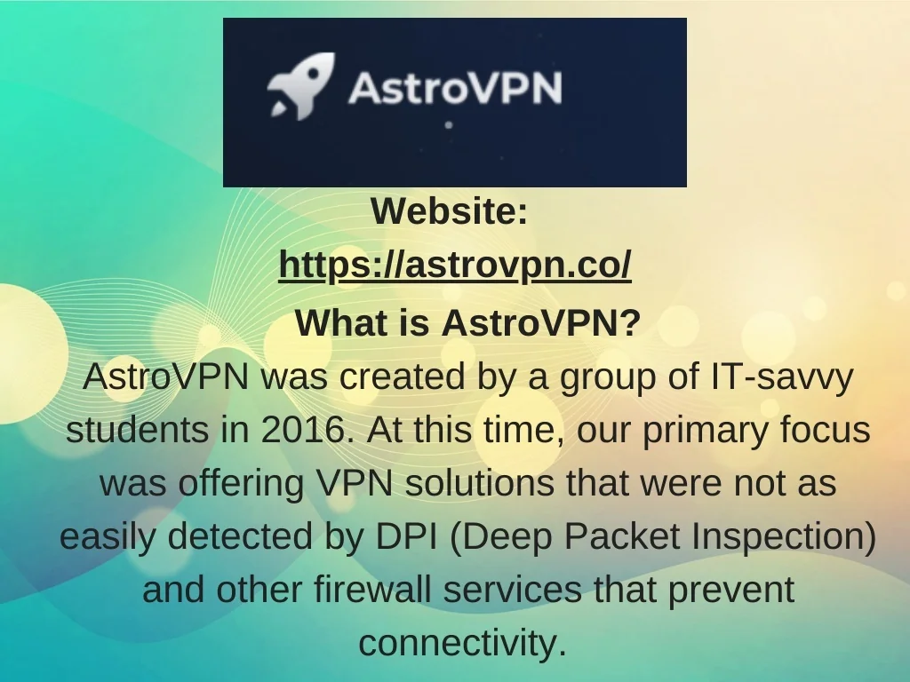 Website: https://astrovpn.co/ What is AstroVPN? AstroVPN was created by a group of IT-savvy students in 2016. At this time, our primary focus was offering VPN solutions that were not as easily detected by DPI (Deep Packet Inspection) and other firewall services that prevent connectivity.