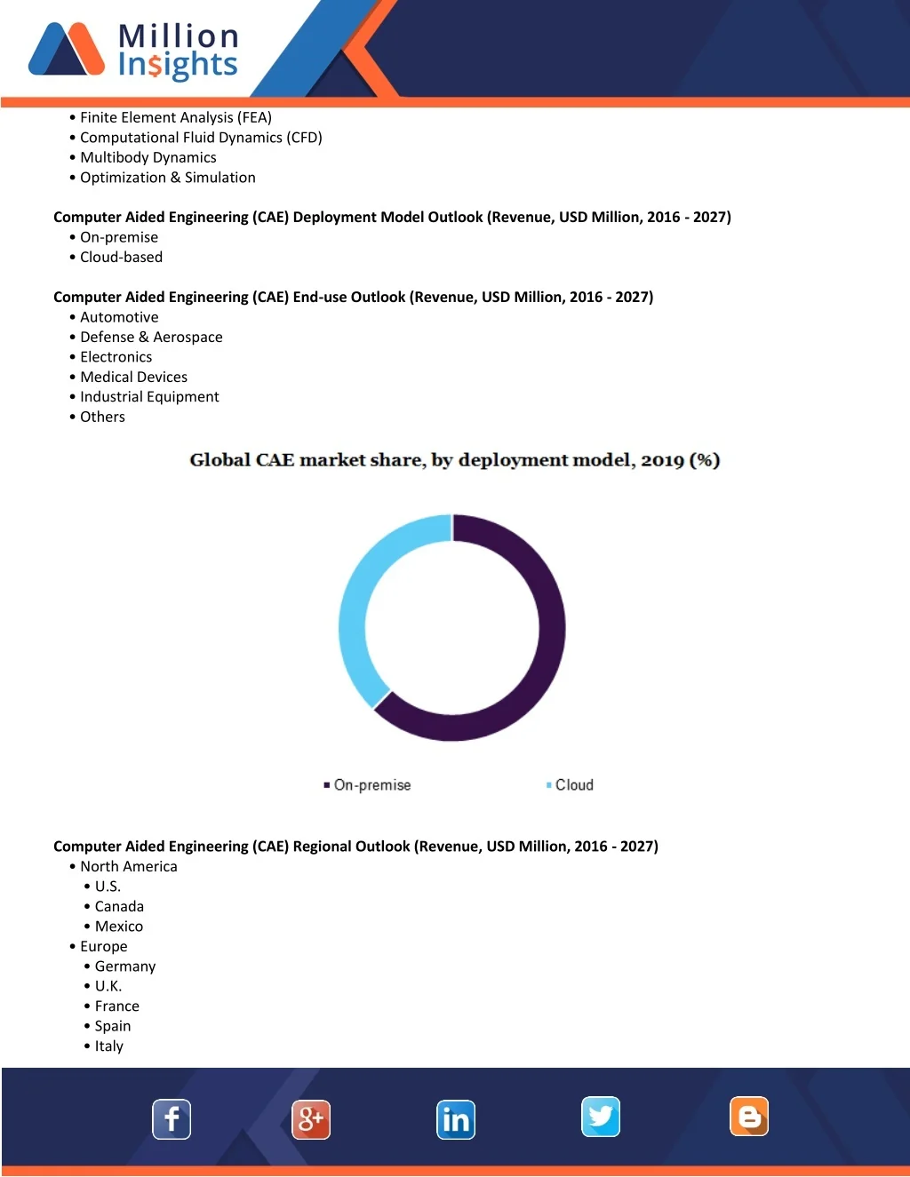Computer Aided Engineering Market Put Forth Analysis with Revenue Worth $14.9 Billion By 2027 “The global computer aided engineering (CAE) market size is anticipated to account for USD 14.9 billion by 2027, growing at 9.3% CAGR. CAE is a use of computer software to simulate the performance of the design with the aim to improve product quality. CAE is used in various industries such as electronics, manufacturing, defense & aerospace and automotive among others.” Global Computer aided engineering (CAE) Market report delivers future development strategies, key companies, Possibility of competition, major challenges analysis. The reports elaborate the expansion rate of the Computer aided engineering (CAE) market supported the highest company profile analysis. This report providing an in-depth analysis, market size, and evaluation for the developing segment among the industry. Computer aided engineering (CAE) Market report will help you take expert decisions, recognize opportunities, plan effective professional tactics, plan new schemes, analyse drivers and restraints and give you a vision on the Computer aided engineering (CAE) Market forecast. The Computer aided engineering (CAE) Market report discusses the primary industry growth drivers and challenges that the vendors and the market as a whole face and provides an overview of the key trends emerging in the market. It also talks about the market size of different segments and their growth aspects along with key leading countries in Americas, Asia-Pacific, Europe, the Middle East, and Africa regions. The global computer aided engineering (CAE) market size is anticipated to account for USD 14.9 billion by 2027, growing at 9.3% CAGR. CAE is a use of computer software to simulate the performance of the design with the aim to improve product quality. CAE is used in various industries such as electronics, manufacturing, defense & aerospace and automotive among others. In the electronics industry, CAE is used in the manufacturing of various components such as smartphone, tablets and other IoT solution. Wearable devices are the major electronic products where CAE is used predominantly. In the recent past, there has been significant growth in the adoption of wearable technology in various applications such as education, fitness, gaming and transportation. Further, miniaturization of sensors and electronic devices are likely to drive the use of CAE software in electronics industries. Request Sample Copy of This Market Research @ https://www.millioninsights.com/industry-reports/computer-aided-engineering-cae-market/request-sample