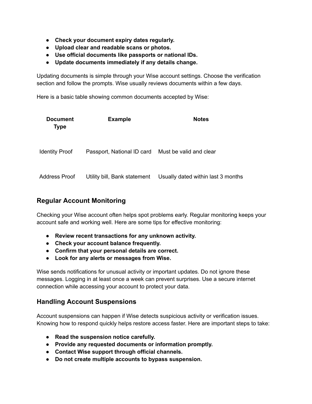 ● Check your document expiry dates regularly. ● Upload clear and readable scans or photos. ● Use official documents like passports or national IDs. ● Update documents immediately if any details change. Updating documents is simple through your Wise account settings. Choose the verification section and follow the prompts. Wise usually reviews documents within a few days. Here is a basic table showing common documents accepted by Wise: Document Type Example Notes Identity Proof Passport, National ID card Must be valid and clear Address Proof Utility bill, Bank statement Usually dated within last 3 months Regular Account Monitoring Checking your Wise account often helps spot problems early. Regular monitoring keeps your account safe and working well. Here are some tips for effective monitoring: ● Review recent transactions for any unknown activity. ● Check your account balance frequently. ● Confirm that your personal details are correct. ● Look for any alerts or messages from Wise. Wise sends notifications for unusual activity or important updates. Do not ignore these messages. Logging in at least once a week can prevent surprises. Use a secure internet connection while accessing your account to protect your data. Handling Account Suspensions Account suspensions can happen if Wise detects suspicious activity or verification issues. Knowing how to respond quickly helps restore access faster. Here are important steps to take: ● Read the suspension notice carefully. ● Provide any requested documents or information promptly. ● Contact Wise support through official channels. ● Do not create multiple accounts to bypass suspension.
