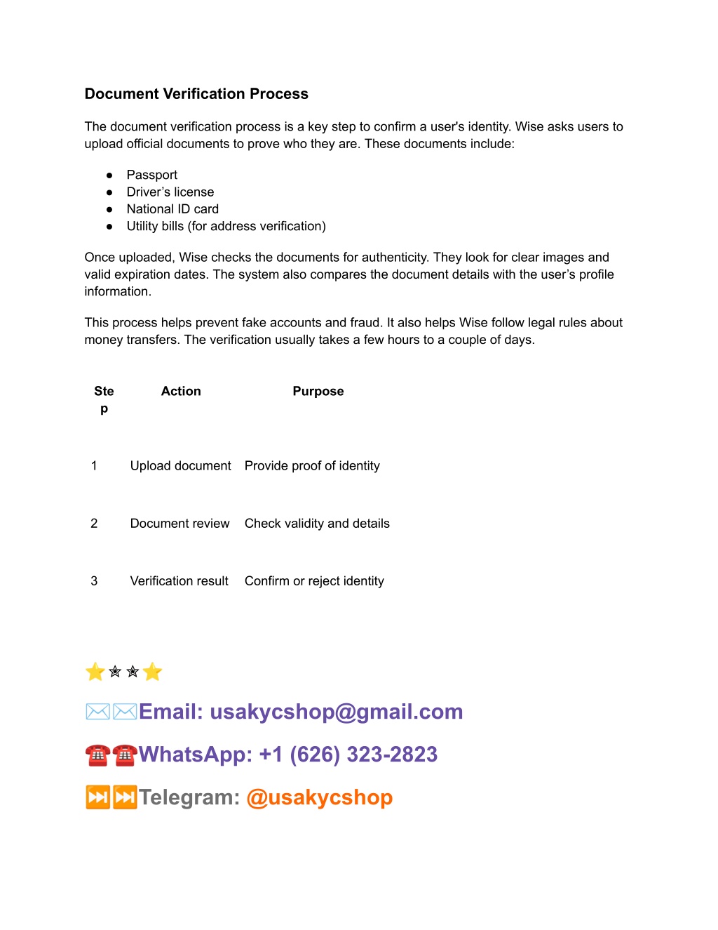 Document Verification Process The document verification process is a key step to confirm a user's identity. Wise asks users to upload official documents to prove who they are. These documents include: ● Passport ● Driver’s license ● National ID card ● Utility bills (for address verification) Once uploaded, Wise checks the documents for authenticity. They look for clear images and valid expiration dates. The system also compares the document details with the user’s profile information. This process helps prevent fake accounts and fraud. It also helps Wise follow legal rules about money transfers. The verification usually takes a few hours to a couple of days. Ste p Action Purpose 1 Upload document Provide proof of identity 2 Document review Check validity and details 3 Verification result Confirm or reject identity ⭐✮✮⭐ ✉✉Email: usakycshop@gmail.com ☎☎WhatsApp: +1 (626) 323-2823 ⏭⏭Telegram: @usakycshop
