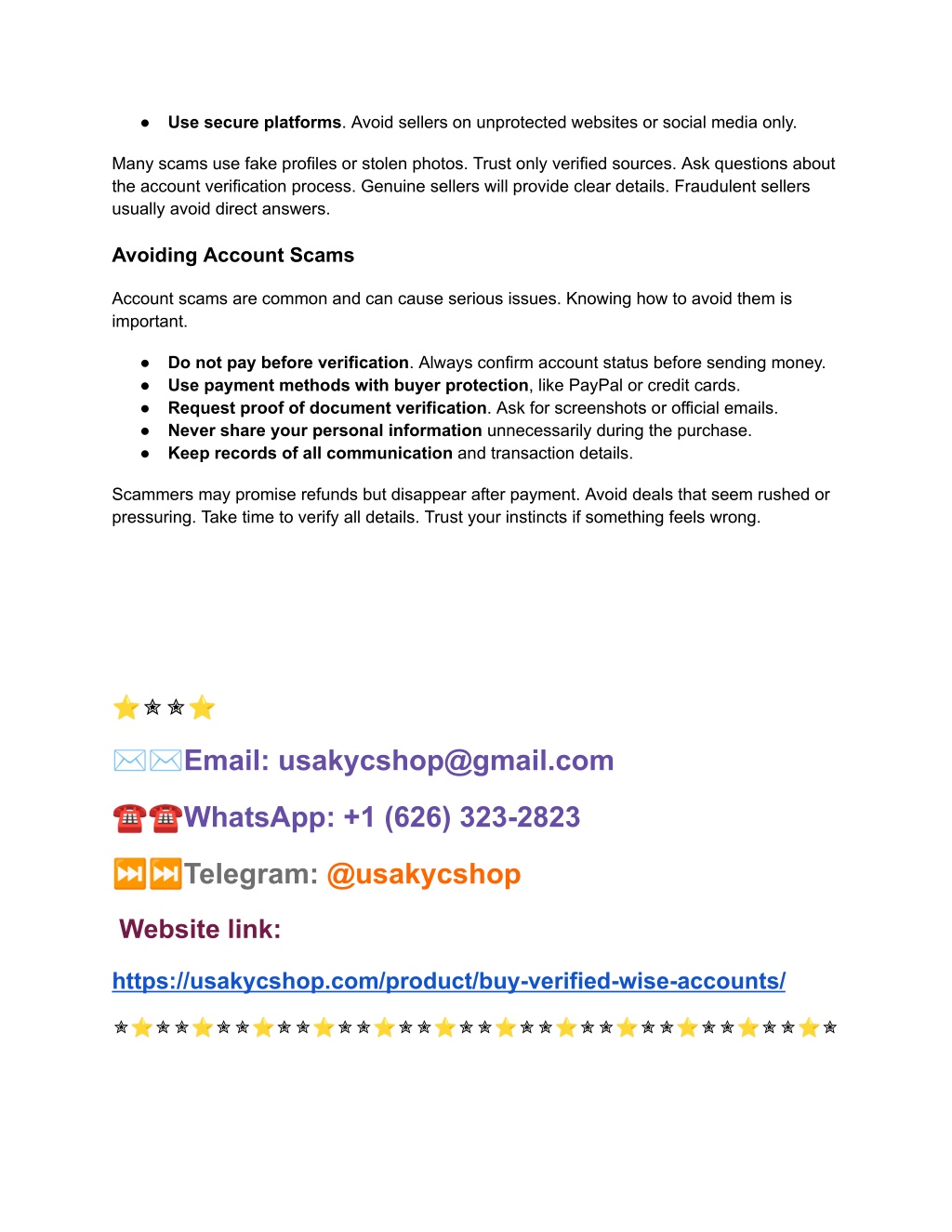 ● Use secure platforms. Avoid sellers on unprotected websites or social media only. Many scams use fake profiles or stolen photos. Trust only verified sources. Ask questions about the account verification process. Genuine sellers will provide clear details. Fraudulent sellers usually avoid direct answers. Avoiding Account Scams Account scams are common and can cause serious issues. Knowing how to avoid them is important. ● Do not pay before verification. Always confirm account status before sending money. ● Use payment methods with buyer protection, like PayPal or credit cards. ● Request proof of document verification. Ask for screenshots or official emails. ● Never share your personal information unnecessarily during the purchase. ● Keep records of all communication and transaction details. Scammers may promise refunds but disappear after payment. Avoid deals that seem rushed or pressuring. Take time to verify all details. Trust your instincts if something feels wrong. ⭐✮✮⭐ ✉✉Email: usakycshop@gmail.com ☎☎WhatsApp: +1 (626) 323-2823 ⏭⏭Telegram: @usakycshop Website link: https://usakycshop.com/product/buy-verified-wise-accounts/ ✮⭐✮✮⭐✮✮⭐✮✮⭐✮✮⭐✮✮⭐✮✮⭐✮✮⭐✮✮⭐✮✮⭐✮✮⭐✮✮⭐✮