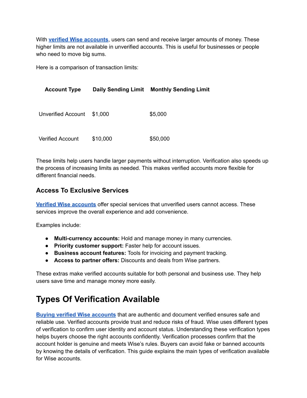 With verified Wise accounts, users can send and receive larger amounts of money. These higher limits are not available in unverified accounts. This is useful for businesses or people who need to move big sums. Here is a comparison of transaction limits: Account Type Daily Sending Limit Monthly Sending Limit Unverified Account $1,000 $5,000 Verified Account $10,000 $50,000 These limits help users handle larger payments without interruption. Verification also speeds up the process of increasing limits as needed. This makes verified accounts more flexible for different financial needs. Access To Exclusive Services Verified Wise accounts offer special services that unverified users cannot access. These services improve the overall experience and add convenience. Examples include: ● Multi-currency accounts: Hold and manage money in many currencies. ● Priority customer support: Faster help for account issues. ● Business account features: Tools for invoicing and payment tracking. ● Access to partner offers: Discounts and deals from Wise partners. These extras make verified accounts suitable for both personal and business use. They help users save time and manage money more easily. Types Of Verification Available Buying verified Wise accounts that are authentic and document verified ensures safe and reliable use. Verified accounts provide trust and reduce risks of fraud. Wise uses different types of verification to confirm user identity and account status. Understanding these verification types helps buyers choose the right accounts confidently. Verification processes confirm that the account holder is genuine and meets Wise’s rules. Buyers can avoid fake or banned accounts by knowing the details of verification. This guide explains the main types of verification available for Wise accounts.