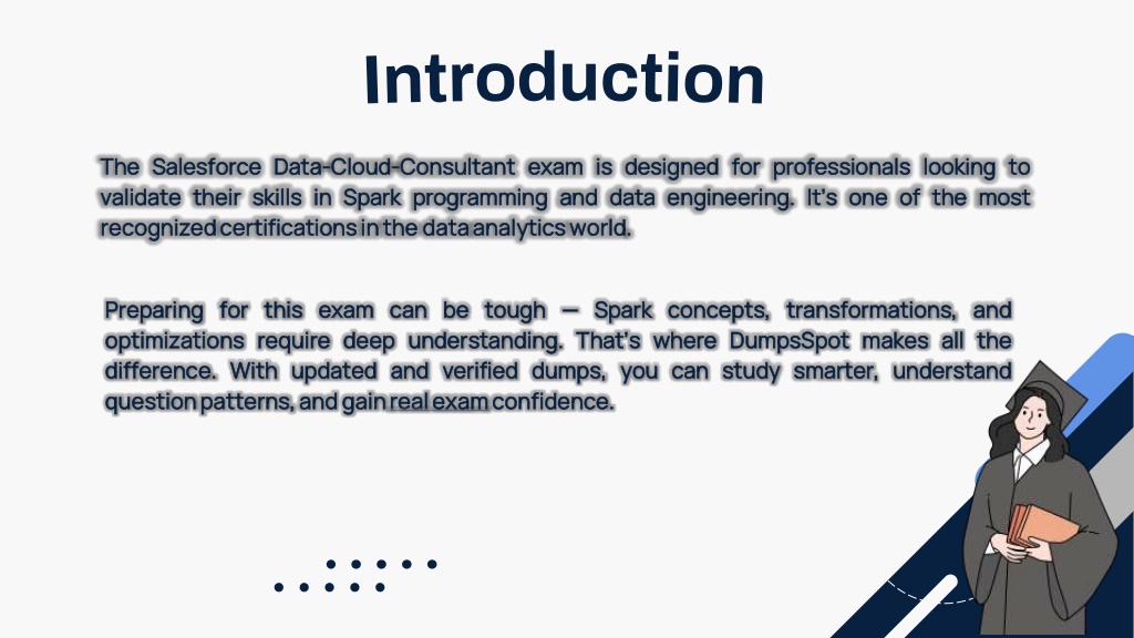 2. The The Salesforce Salesforce Data validate validate their their skills recognized recognizedcertifications certificationsin inthe Data- -Cloud Cloud- -Consultant skills in in Spark Spark programming the data Consultant exam programming and dataanalytics analyticsworld exam is is designed and data data engineering world. . designed for engineering. . It’s for professionals professionals looking It’s one one of looking to of the the most to most Preparing Preparing for optimizations optimizations require difference difference. . With question questionpatterns, patterns,and for this require deep With updated updated and andgain this exam exam can deep understanding understanding. . That’s and verified verified dumps, gainreal realexam examconfidence can be be tough tough — — Spark Spark concepts, concepts, transformations, That’s where where DumpsSpot DumpsSpot makes dumps, you you can can study study smarter, confidence. . transformations, and makes all smarter, understand understand and the all the