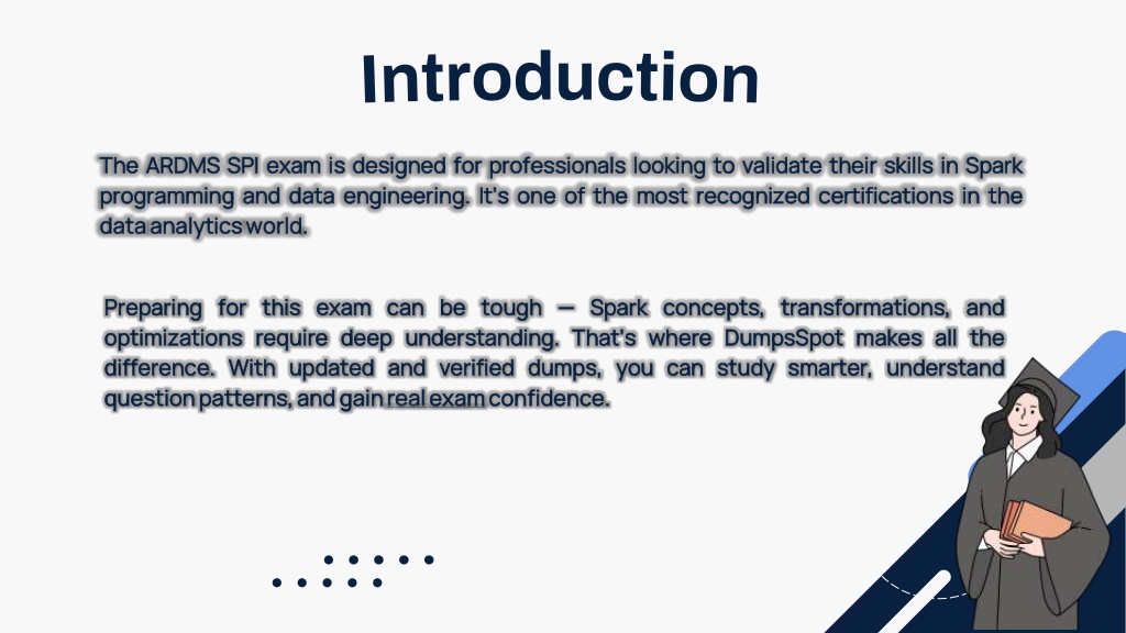 The The ARDMS ARDMS SPI programming programming and data dataanalytics analyticsworld SPI exam exam is is designed and data data engineering engineering. . It’s world. . designed for for professionals professionals looking It’s one one of of the looking to the most most recognized recognized certifications to validate validate their their skills certifications in in the skills in in Spark Spark the Preparing Preparing for optimizations optimizations require difference difference. . With question questionpatterns, patterns,and for this require deep With updated updated and andgain this exam exam can deep understanding understanding. . That’s and verified verified dumps, gainreal realexam examconfidence can be be tough tough — — Spark Spark concepts, concepts, transformations, That’s where where DumpsSpot DumpsSpot makes dumps, you you can can study study smarter, confidence. . transformations, and makes all smarter, understand understand and the all the