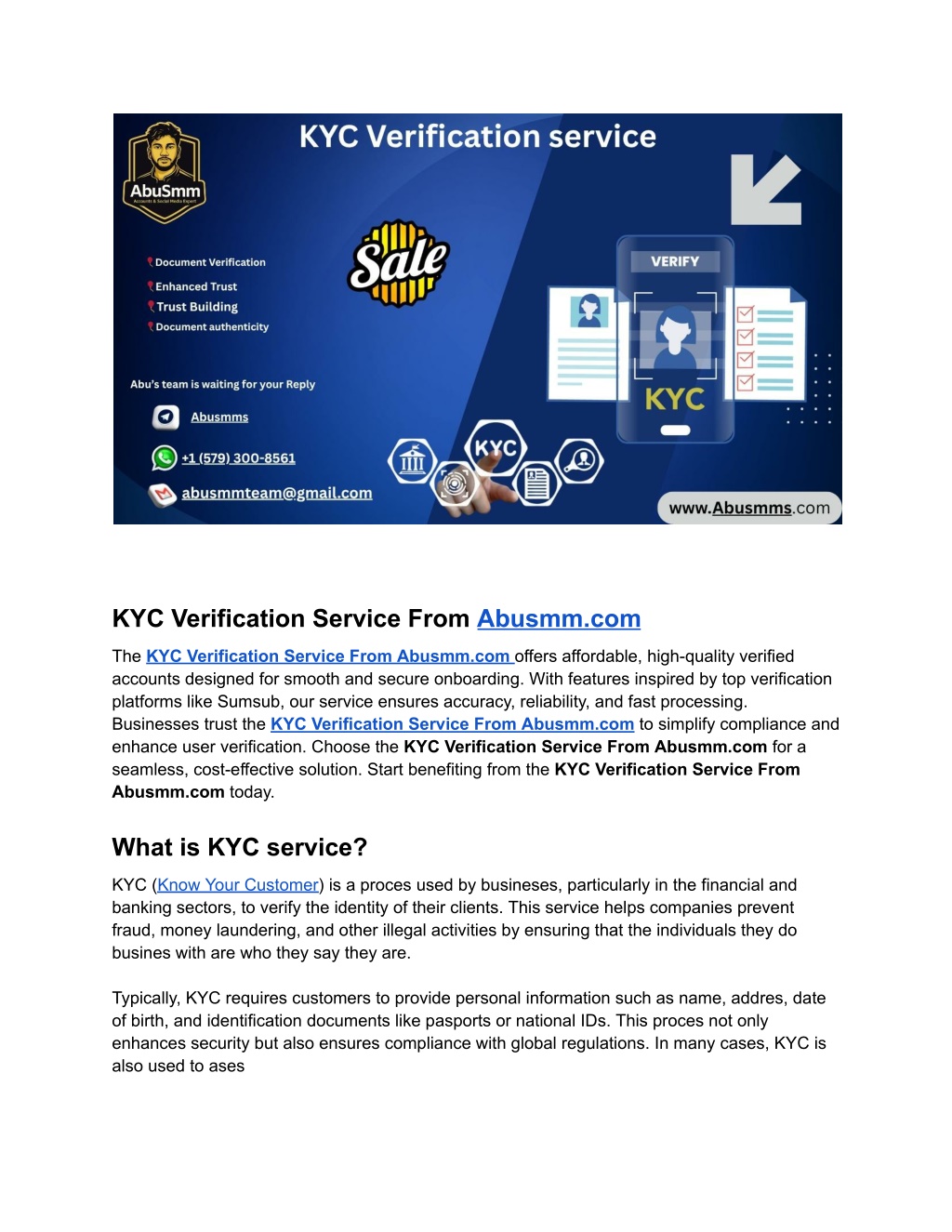 KYC Verification Service KYC Verification Service from abusmm offers fast, secure, and affordable identity verification solutions. Perfect for businesses needing trusted user verification, our delivers high-quality verified accounts using advanced systems similar to Sumsub. Whether you’re in crypto, finance, or e-commerce, our service ensures compliance with global KYC standards. With instant delivery, full privacy, and competitive pricing, abusmm helps you save time and avoid verification delays. Choose KYC Verification Service from usa to streamline your onboarding process and protect your platform from fraud — all without breaking the bank. KYC Verification Service Features: ● ?Government-issued ID verification ● ?Facial recognition & liveness detection ● ?ML (Anti-Money Laundering) checks ● ?Instant verification process ● ?GDPR-compliant data handling ● ?Mobile-friendly interface Abu’s team is waiting for your Reply ? ● ?Telegram : Abusmms ● ?Whatsapp : +1 (579) 300-8561 ● ?Email : abusmmteam@gmail.com ● ?Facebook Page : Abusmm ● ?Signal : +1 (682) 474-9468 ● https://abusmm.com/product/kyc-verification-service/