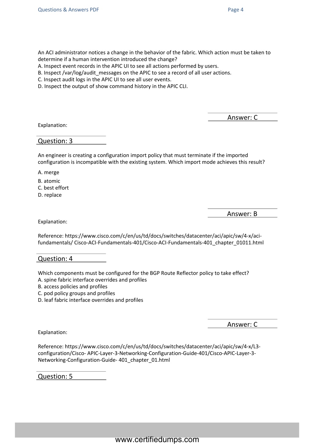 Questions & Answers PDF Page 4 An ACI administrator notices a change in the behavior of the fabric. Which action must be taken to determine if a human intervention introduced the change? A. Inspect event records in the APIC UI to see all actions performed by users. B. Inspect /var/log/audit_messages on the APIC to see a record of all user actions. C. Inspect audit logs in the APIC UI to see all user events. D. Inspect the output of show command history in the APIC CLI. Answer: C Explanation: Question: 3 An engineer is creating a configuration import policy that must terminate if the imported configuration is incompatible with the existing system. Which import mode achieves this result? A. merge B. atomic C. best effort D. replace Answer: B Explanation: Reference: https://www.cisco.com/c/en/us/td/docs/switches/datacenter/aci/apic/sw/4-x/aci- fundamentals/ Cisco-ACI-Fundamentals-401/Cisco-ACI-Fundamentals-401_chapter_01011.html Question: 4 Which components must be configured for the BGP Route Reflector policy to take effect? A. spine fabric interface overrides and profiles B. access policies and profiles C. pod policy groups and profiles D. leaf fabric interface overrides and profiles Answer: C Explanation: Reference: https://www.cisco.com/c/en/us/td/docs/switches/datacenter/aci/apic/sw/4-x/L3- configuration/Cisco- APIC-Layer-3-Networking-Configuration-Guide-401/Cisco-APIC-Layer-3- Networking-Configuration-Guide- 401_chapter_01.html Question: 5 www.certifiedumps.com