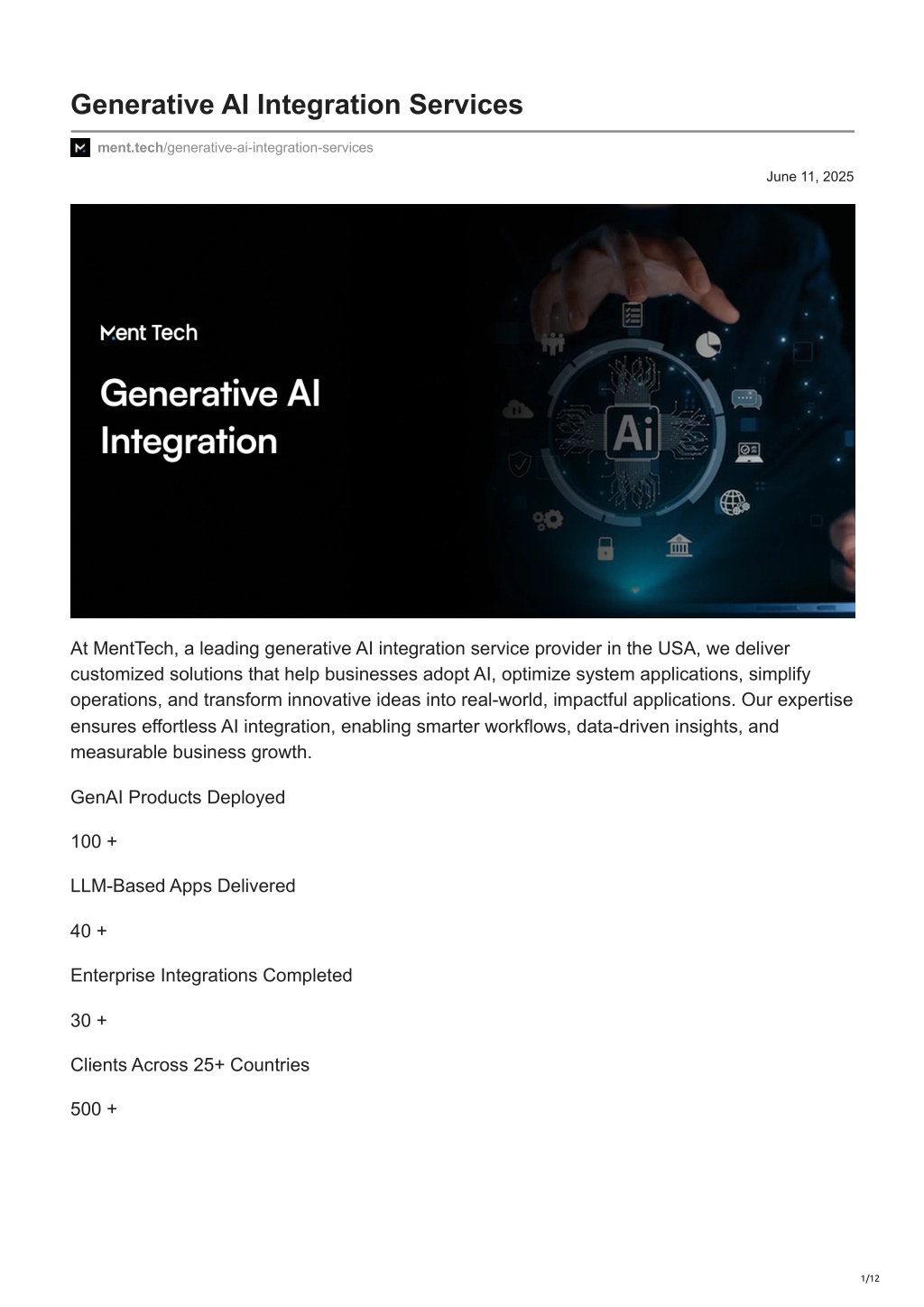Generative AI Integration Services ment.tech/generative-ai-integration-services June 11, 2025 At MentTech, a leading generative AI integration service provider in the USA, we deliver customized solutions that help businesses adopt AI, optimize system applications, simplify operations, and transform innovative ideas into real-world, impactful applications. Our expertise ensures effortless AI integration, enabling smarter workflows, data-driven insights, and measurable business growth. GenAI Products Deployed 100 + LLM-Based Apps Delivered 40 + Enterprise Integrations Completed 30 + Clients Across 25+ Countries 500 + 1/12