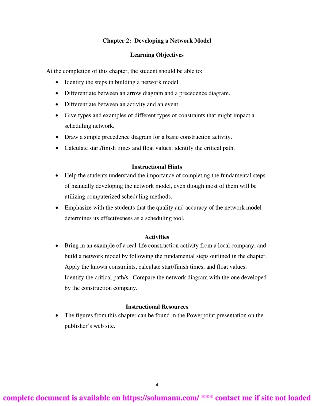 Chapter 2: Developing a Network Model Learning Objectives At the completion of this chapter, the student should be able to: Identify the steps in building a network model. Differentiate between an arrow diagram and a precedence diagram. Differentiate between an activity and an event. Give types and examples of different types of constraints that might impact a scheduling network. Draw a simple precedence diagram for a basic construction activity. Calculate start/finish times and float values; identify the critical path. Instructional Hints Help the students understand the importance of completing the fundamental steps of manually developing the network model, even though most of them will be utilizing computerized scheduling methods. Emphasize with the students that the quality and accuracy of the network model determines its effectiveness as a scheduling tool. Activities Bring in an example of a real-life construction activity from a local company, and build a network model by following the fundamental steps outlined in the chapter. Apply the known constraints, calculate start/finish times, and float values. Identify the critical path/s. Compare the network diagram with the one developed by the construction company. Instructional Resources The figures from this chapter can be found in the Powerpoint presentation on the publisher’s web site. 4 complete document is available on https://solumanu.com/ *** contact me if site not loaded