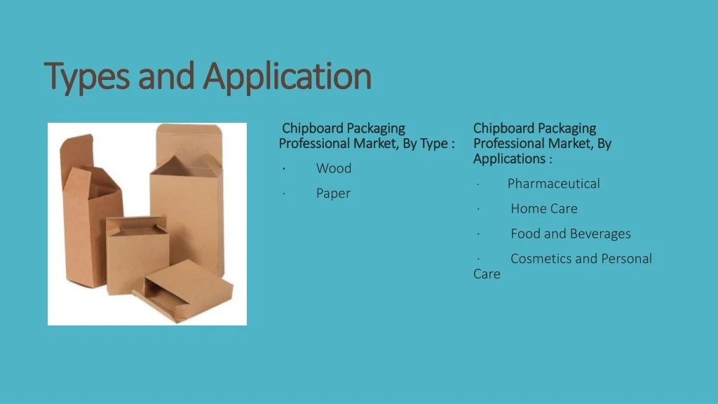 Types and Application Types and Application Chipboard Packaging Chipboard Packaging Professional Market, By Type : Professional Market, By Type : Chipboard Packaging Chipboard Packaging Professional Market, By Professional Market, By Applications Applications : : · · Wood · Pharmaceutical · Paper · Home Care · Food and Beverages · Cosmetics and Personal Care