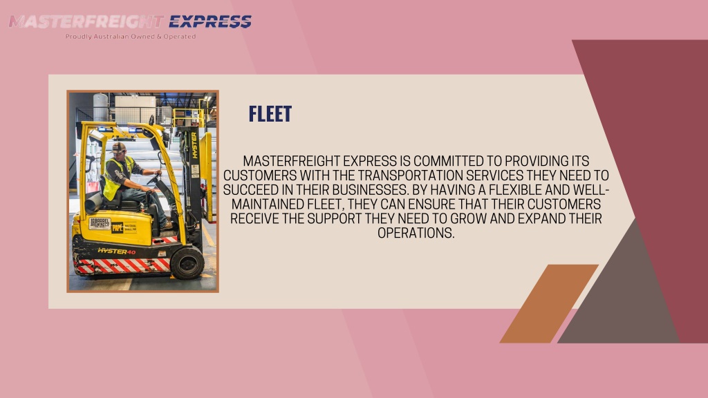 FLEET MASTERFREIGHT EXPRESS IS COMMITTED TO PROVIDING ITS CUSTOMERS WITH THE TRANSPORTATION SERVICES THEY NEED TO SUCCEED IN THEIR BUSINESSES. BY HAVING A FLEXIBLE AND WELL- MAINTAINED FLEET, THEY CAN ENSURE THAT THEIR CUSTOMERS RECEIVE THE SUPPORT THEY NEED TO GROW AND EXPAND THEIR OPERATIONS.
