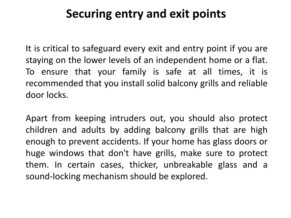 Securing entry and exit points It is critical to safeguard every exit and entry point if you are staying on the lower levels of an independent home or a flat. To ensure that your family is safe at all times, it is recommended that you install solid balcony grills and reliable door locks. Apart from keeping intruders out, you should also protect children and adults by adding balcony grills that are high enough to prevent accidents. If your home has glass doors or huge windows that don't have grills, make sure to protect them. In certain cases, thicker, unbreakable glass and a sound-locking mechanism should be explored.