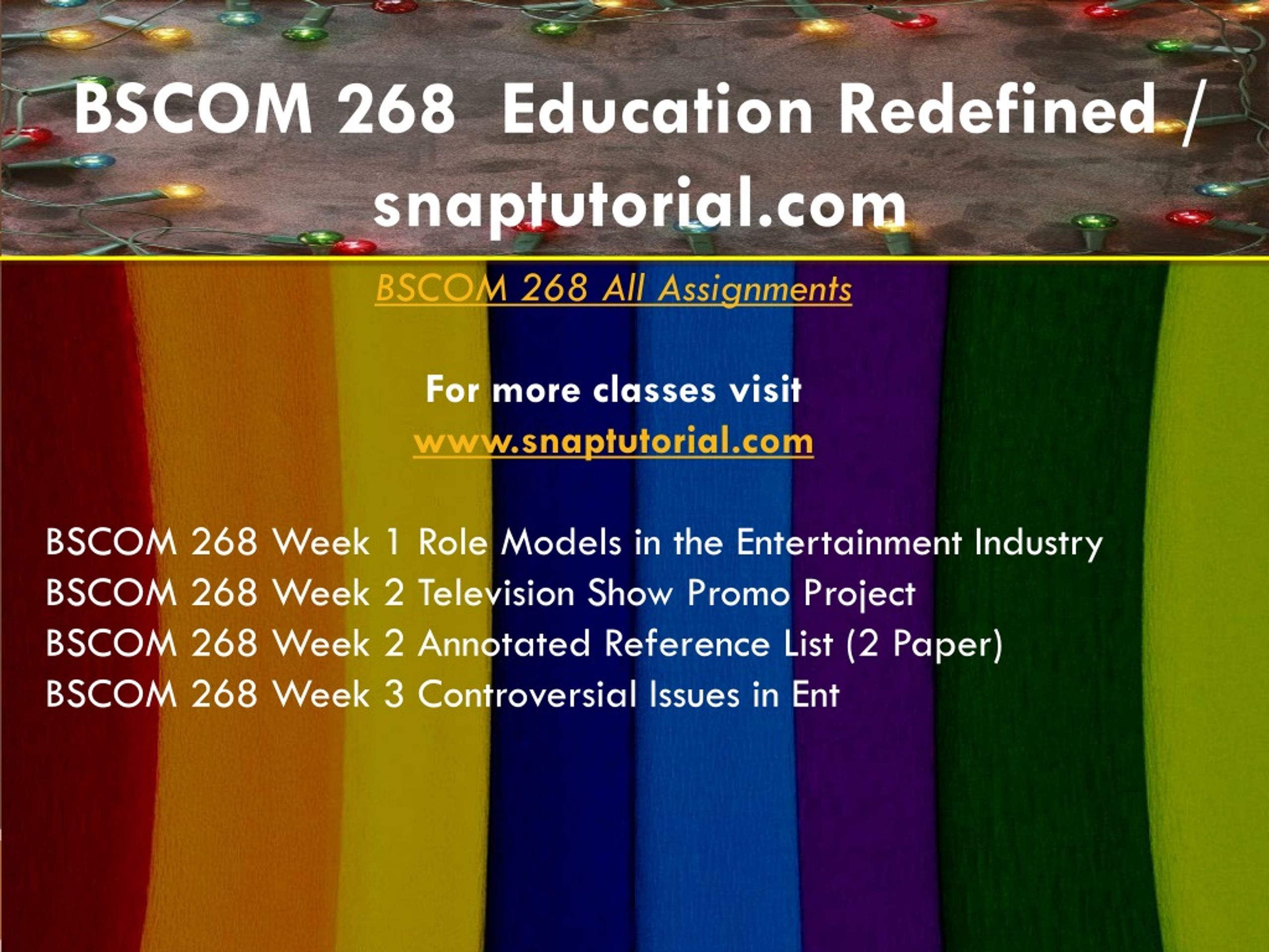BSCOM 268 Education Redefined / snaptutorial.com BSCOM 268 All Assignments For more classes visit www.snaptutorial.com BSCOM 268 Week 1 Role Models in the Entertainment Industry BSCOM 268 Week 2 Television Show Promo Project BSCOM 268 Week 2 Annotated Reference List (2 Paper) BSCOM 268 Week 3 Controversial Issues in Ent