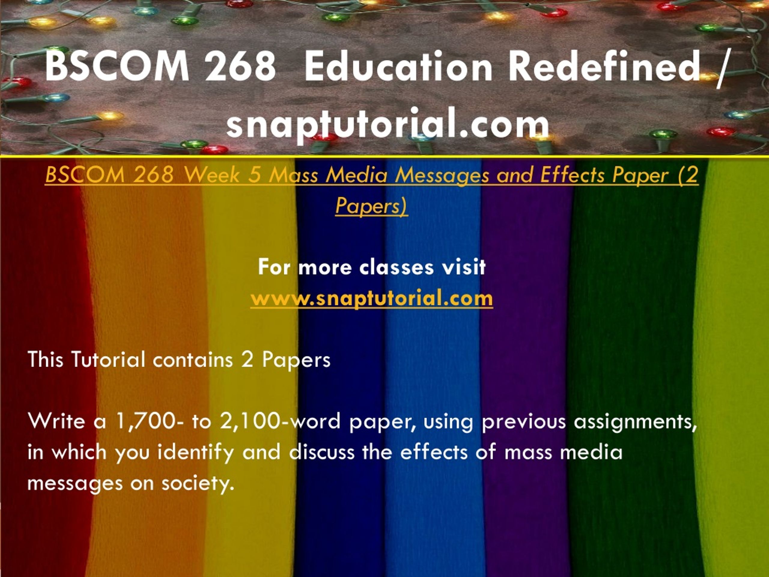 BSCOM 268 Education Redefined / snaptutorial.com BSCOM 268 Week 5 Mass Media Messages and Effects Paper (2 Papers) For more classes visit www.snaptutorial.com This Tutorial contains 2 Papers Write a 1,700- to 2,100-word paper, using previous assignments, in which you identify and discuss the effects of mass media messages on society.