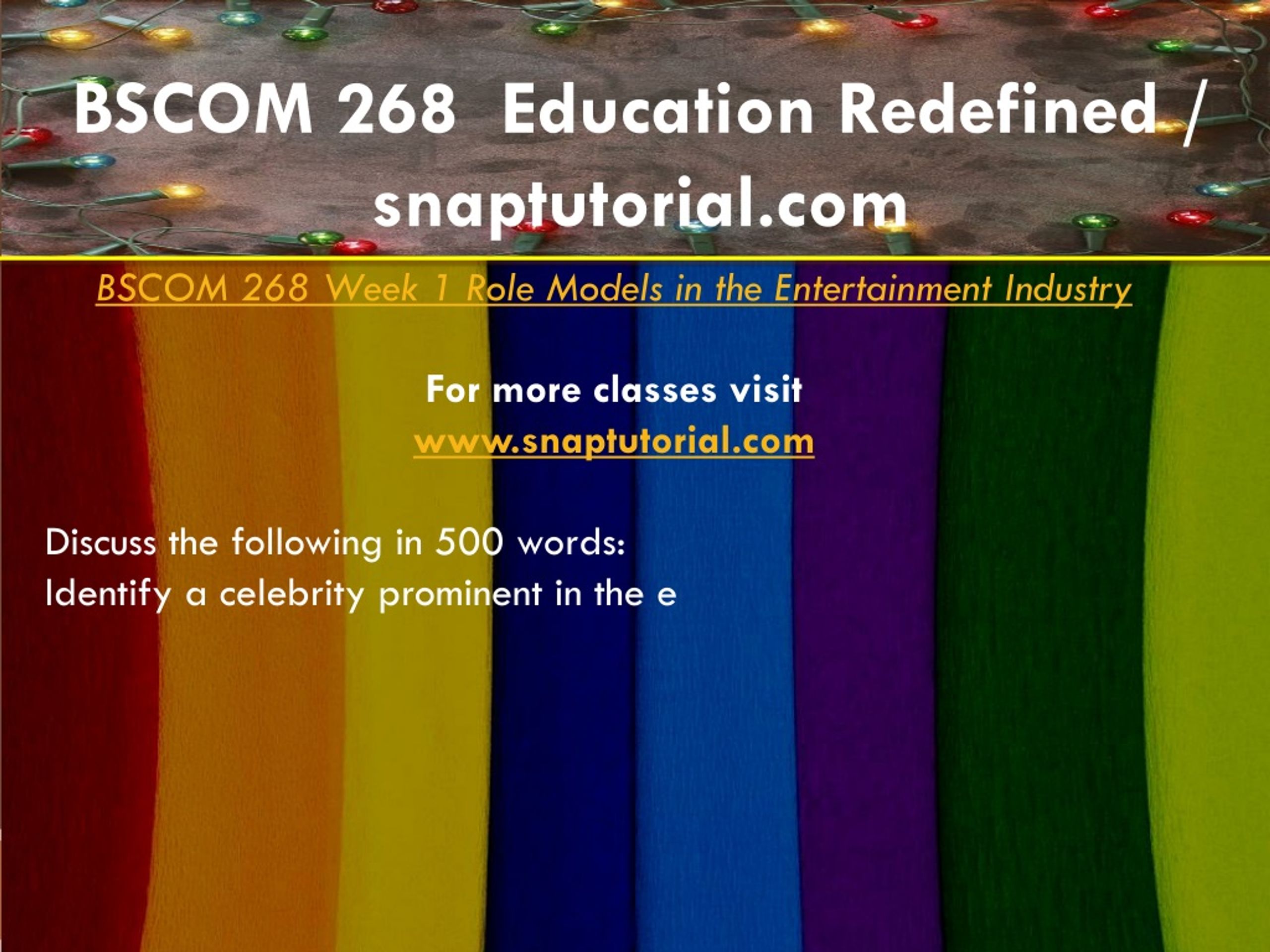 BSCOM 268 Education Redefined / snaptutorial.com BSCOM 268 Week 1 Role Models in the Entertainment Industry For more classes visit www.snaptutorial.com Discuss the following in 500 words: Identify a celebrity prominent in the e