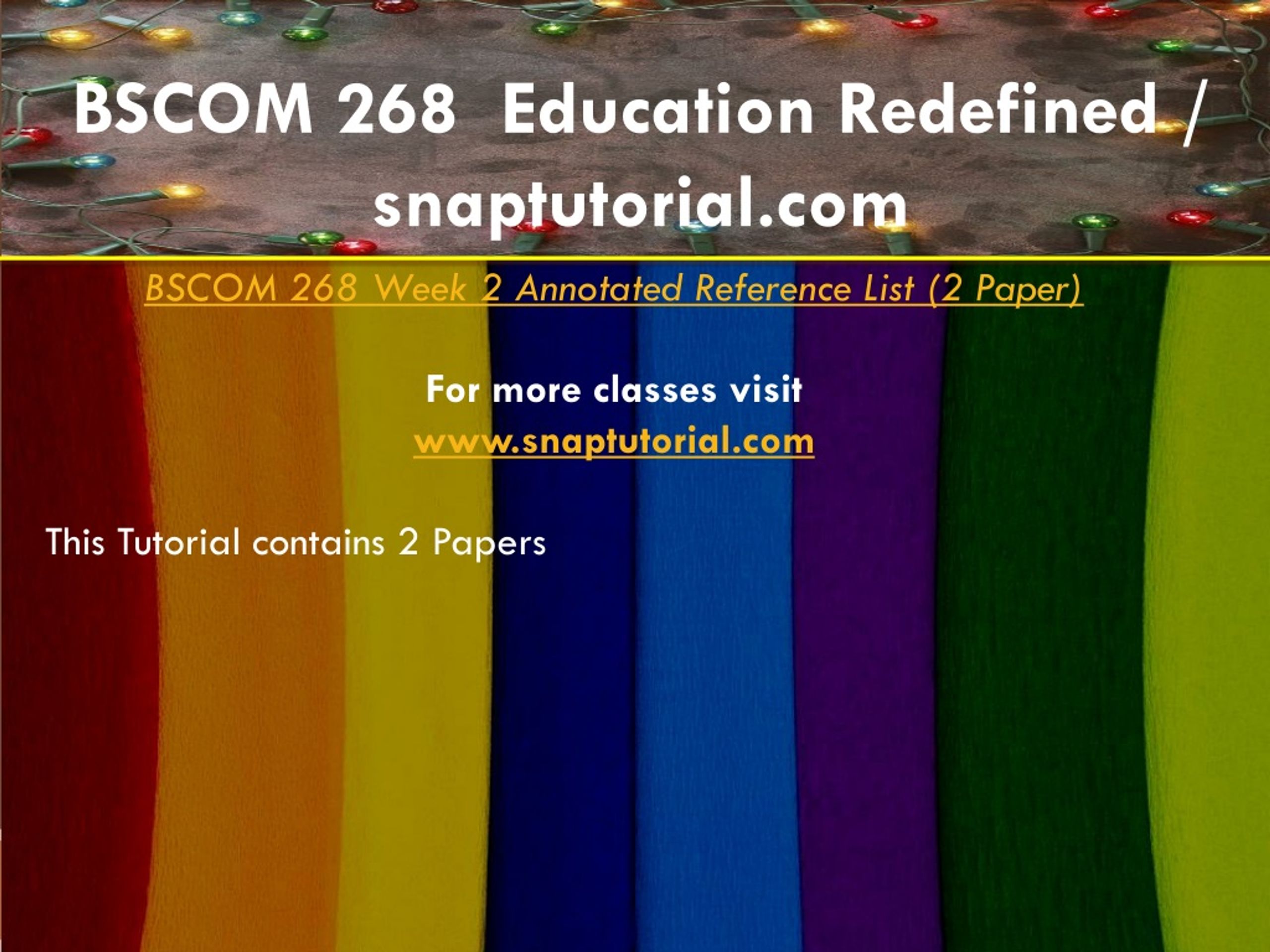 BSCOM 268 Education Redefined / snaptutorial.com BSCOM 268 Week 2 Annotated Reference List (2 Paper) For more classes visit www.snaptutorial.com This Tutorial contains 2 Papers