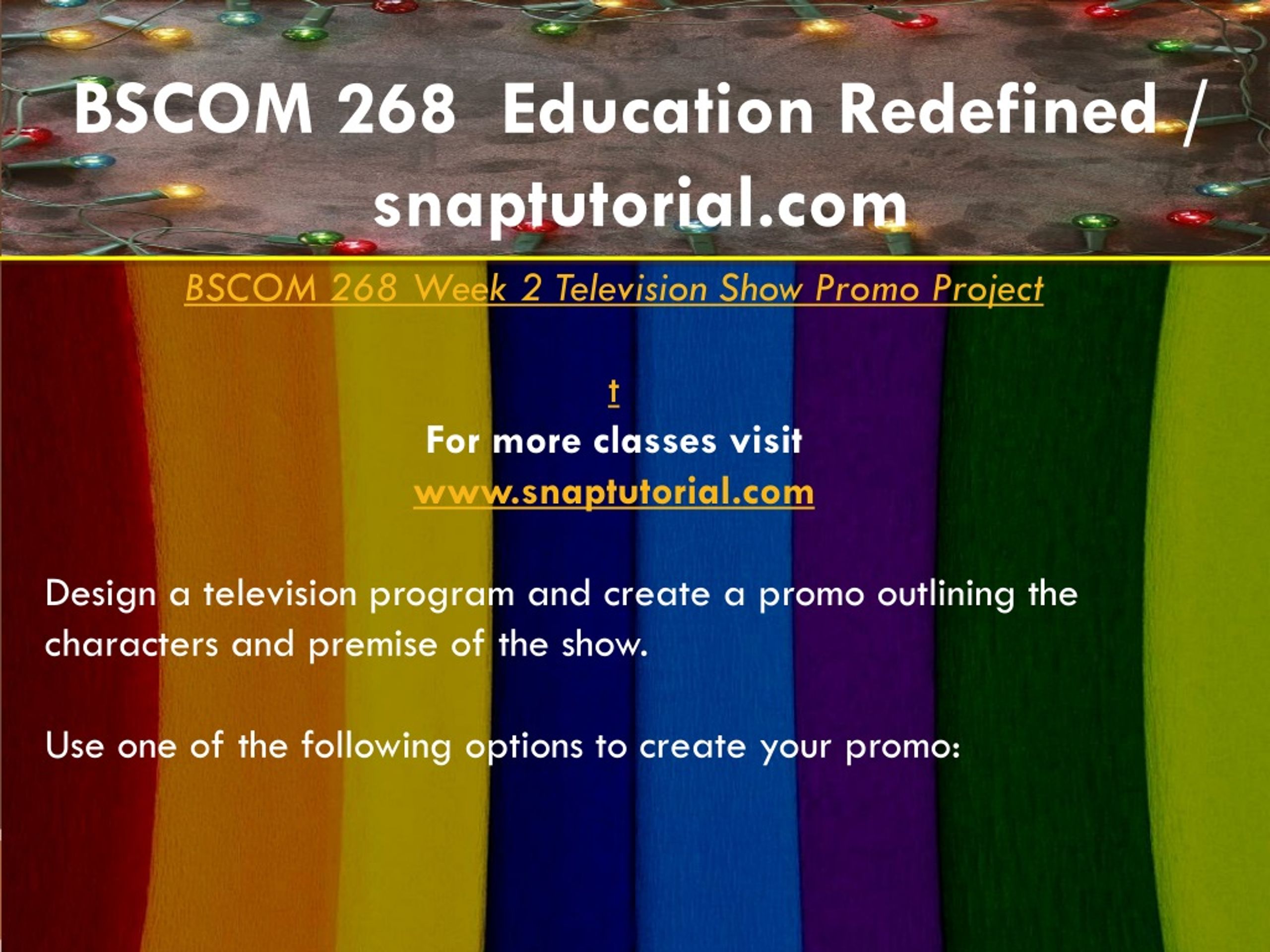 BSCOM 268 Education Redefined / snaptutorial.com BSCOM 268 Week 2 Television Show Promo Project t For more classes visit www.snaptutorial.com Design a television program and create a promo outlining the characters and premise of the show. Use one of the following options to create your promo: