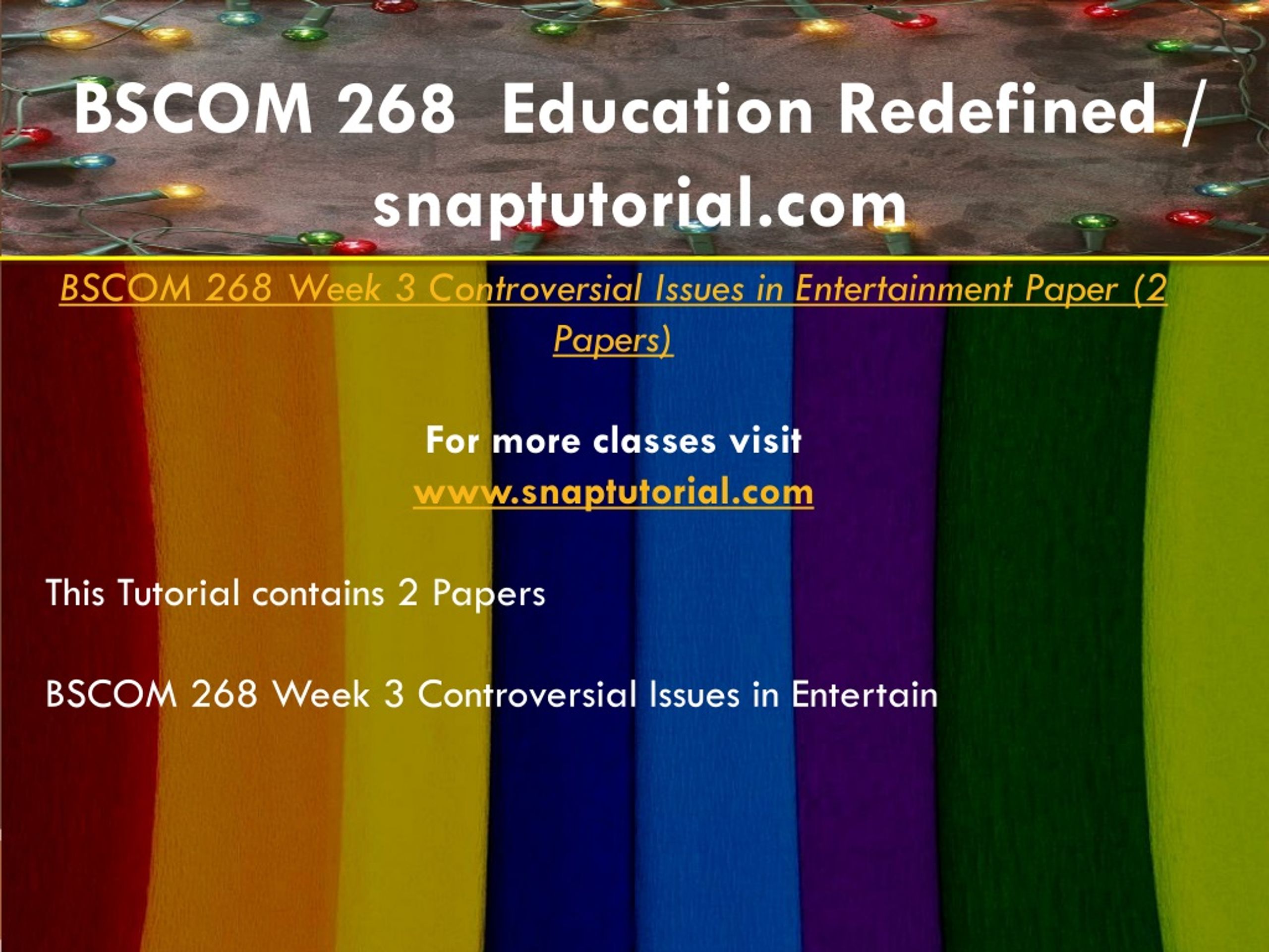 BSCOM 268 Education Redefined / snaptutorial.com BSCOM 268 Week 3 Controversial Issues in Entertainment Paper (2 Papers) For more classes visit www.snaptutorial.com This Tutorial contains 2 Papers BSCOM 268 Week 3 Controversial Issues in Entertain