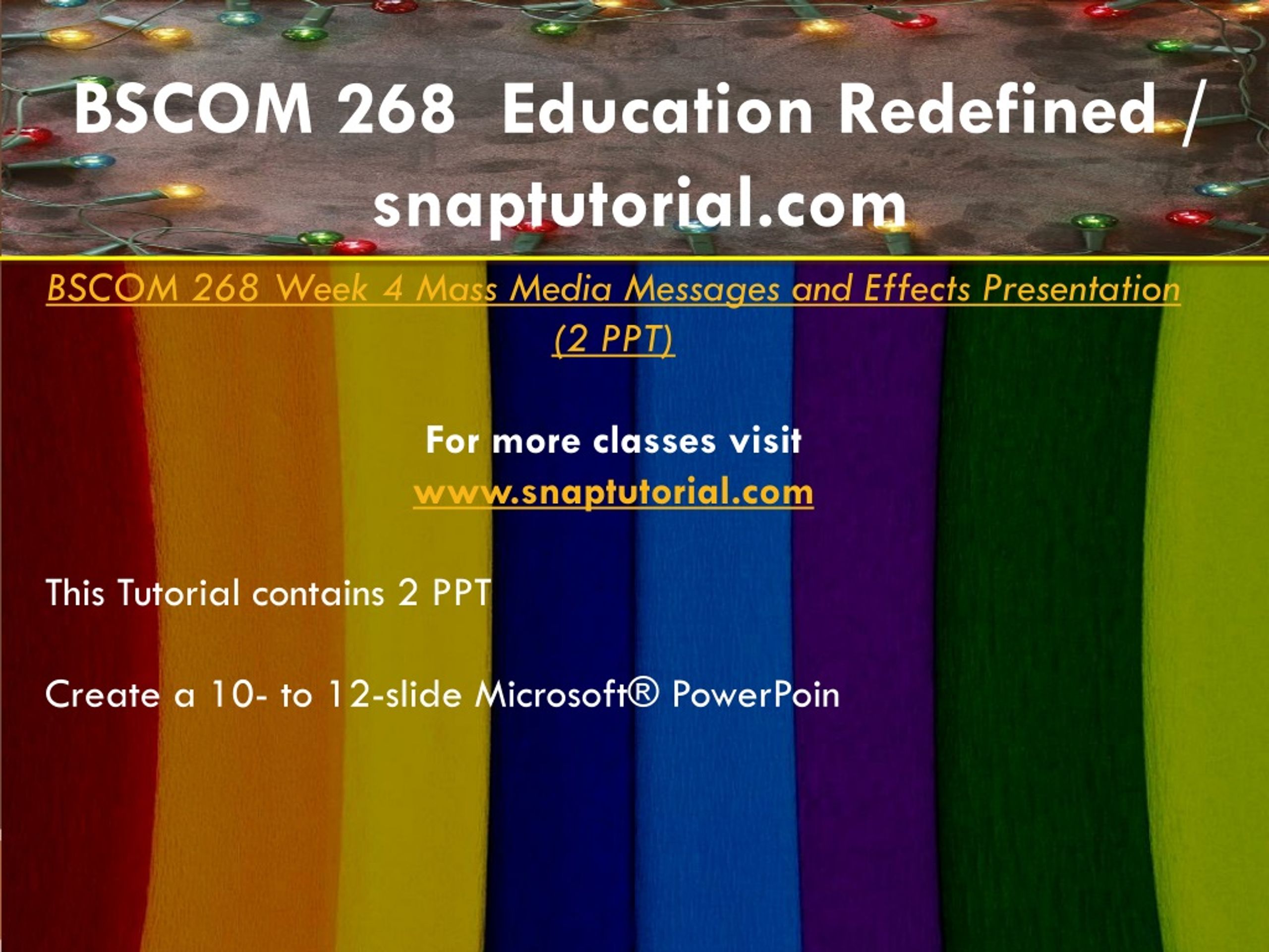 BSCOM 268 Education Redefined / snaptutorial.com BSCOM 268 Week 4 Mass Media Messages and Effects Presentation (2 PPT) For more classes visit www.snaptutorial.com This Tutorial contains 2 PPT Create a 10- to 12-slide Microsoft® PowerPoin