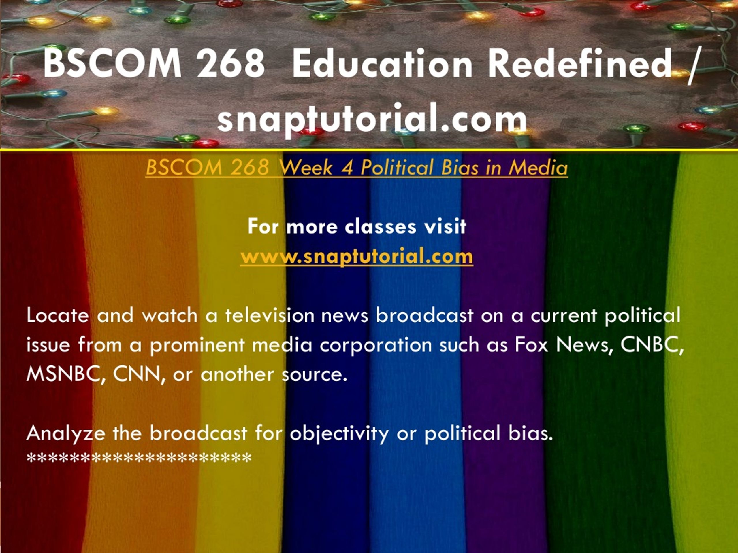 BSCOM 268 Education Redefined / snaptutorial.com BSCOM 268 Week 4 Political Bias in Media For more classes visit www.snaptutorial.com Locate and watch a television news broadcast on a current political issue from a prominent media corporation such as Fox News, CNBC, MSNBC, CNN, or another source. Analyze the broadcast for objectivity or political bias. *********************