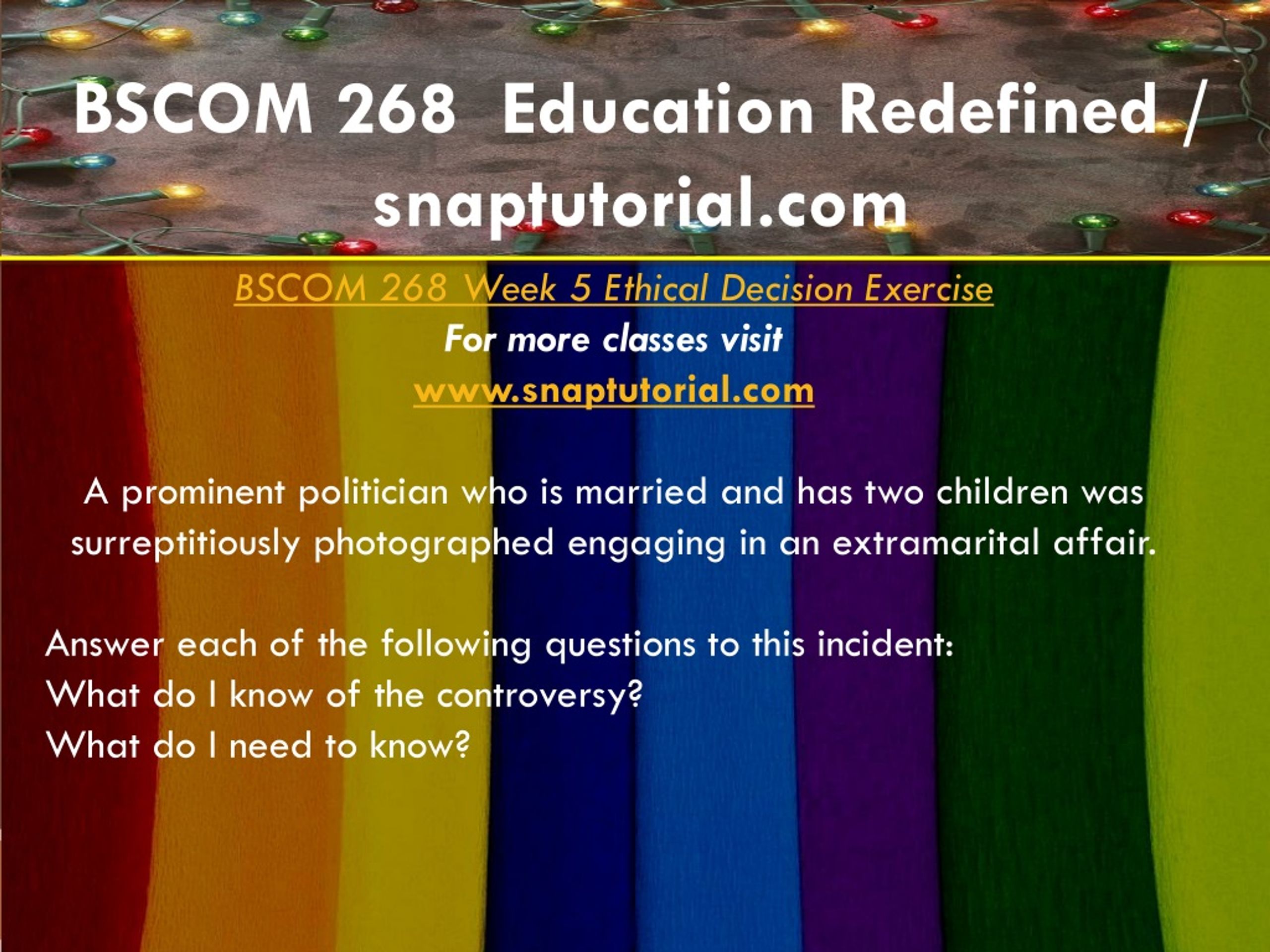 BSCOM 268 Education Redefined / snaptutorial.com BSCOM 268 Week 5 Ethical Decision Exercise For more classes visit www.snaptutorial.com A prominent politician who is married and has two children was surreptitiously photographed engaging in an extramarital affair. Answer each of the following questions to this incident: What do I know of the controversy? What do I need to know?