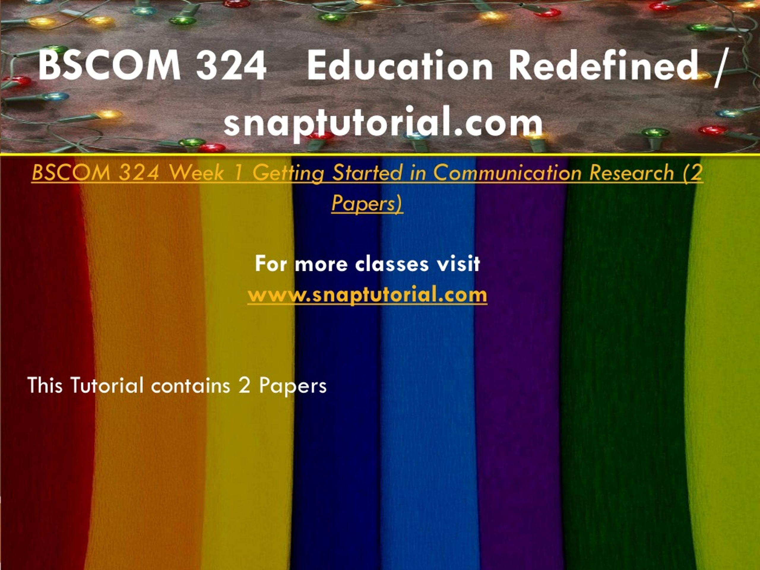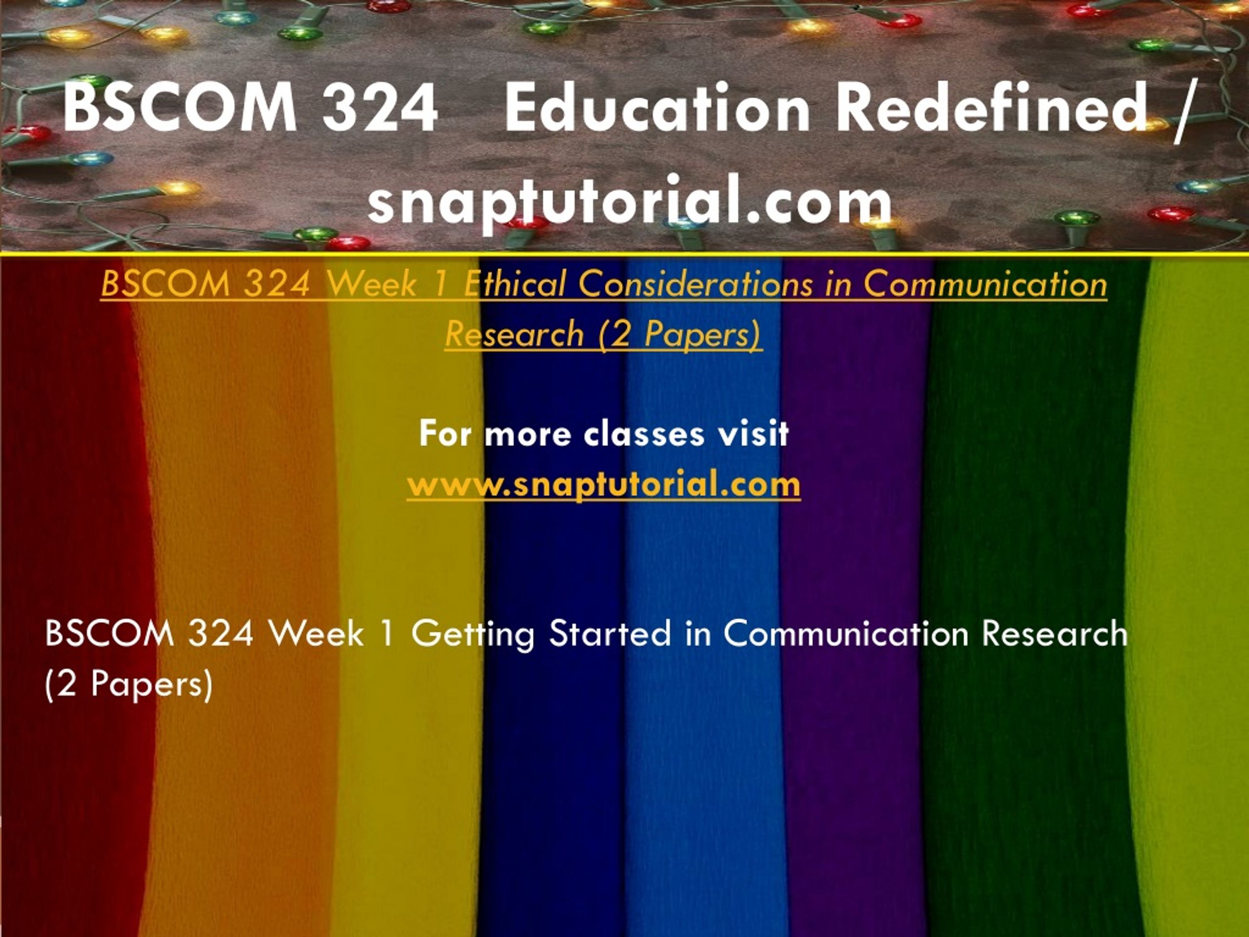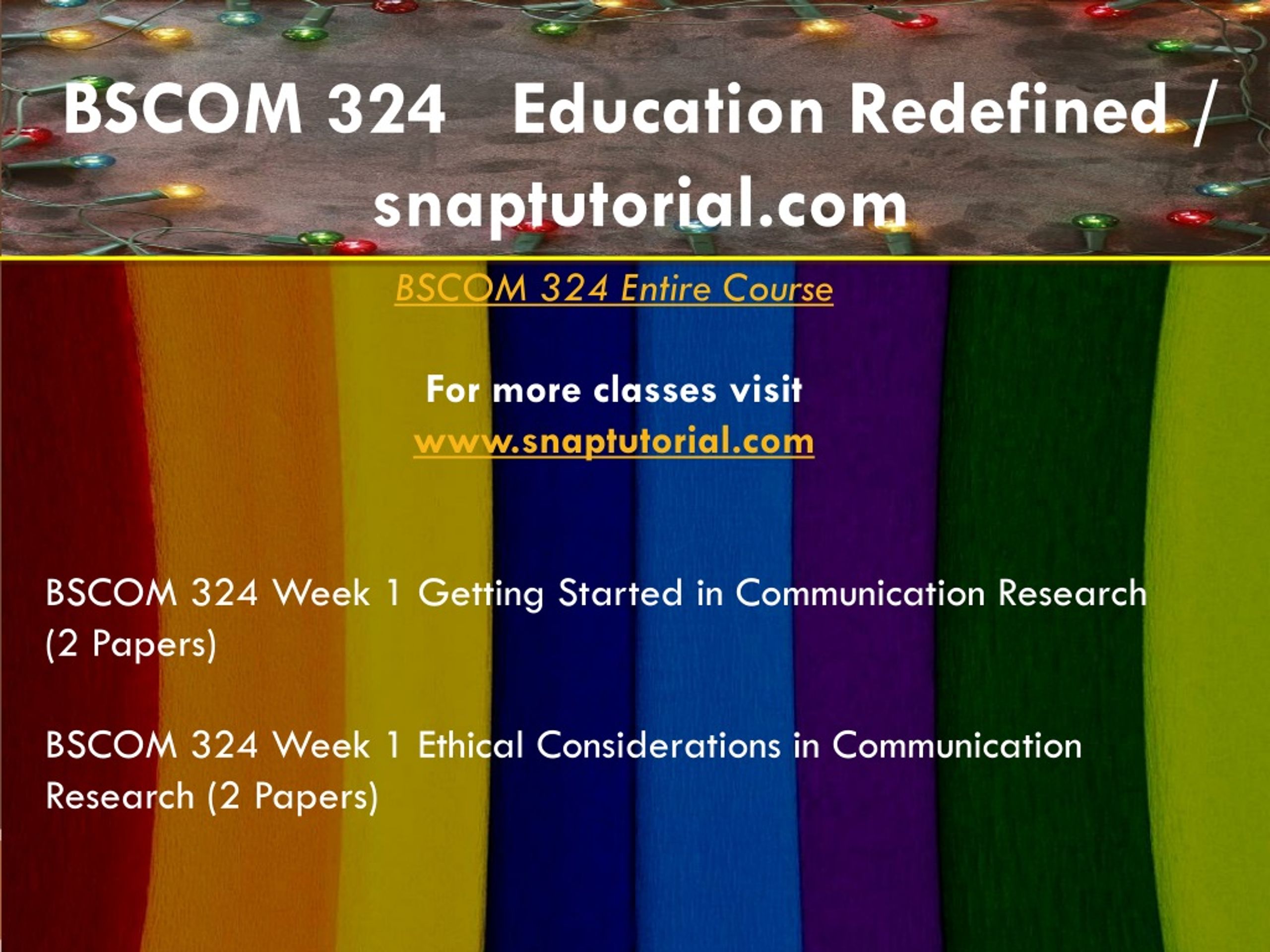 BSCOM 324 Education Redefined / snaptutorial.com BSCOM 324 Entire Course For more classes visit www.snaptutorial.com BSCOM 324 Week 1 Getting Started in Communication Research (2 Papers) BSCOM 324 Week 1 Ethical Considerations in Communication Research (2 Papers)
