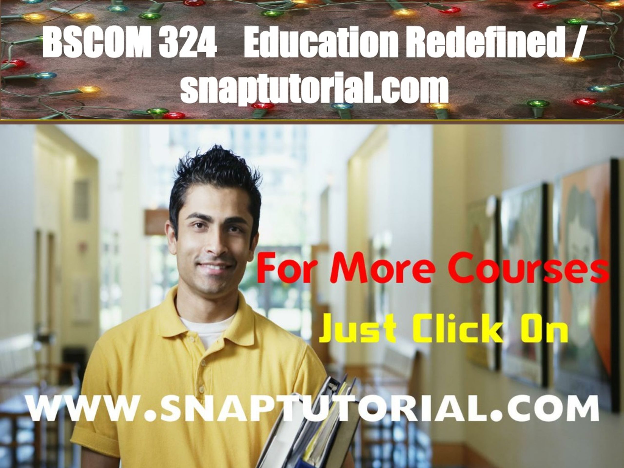 BSCOM 324 Education Redefined / snaptutorial.com BSCOM 324 Week 1 Getting Started in Communication Research (2 Papers) For more classes visit www.snaptutorial.com This Tutorial contains 2 Papers