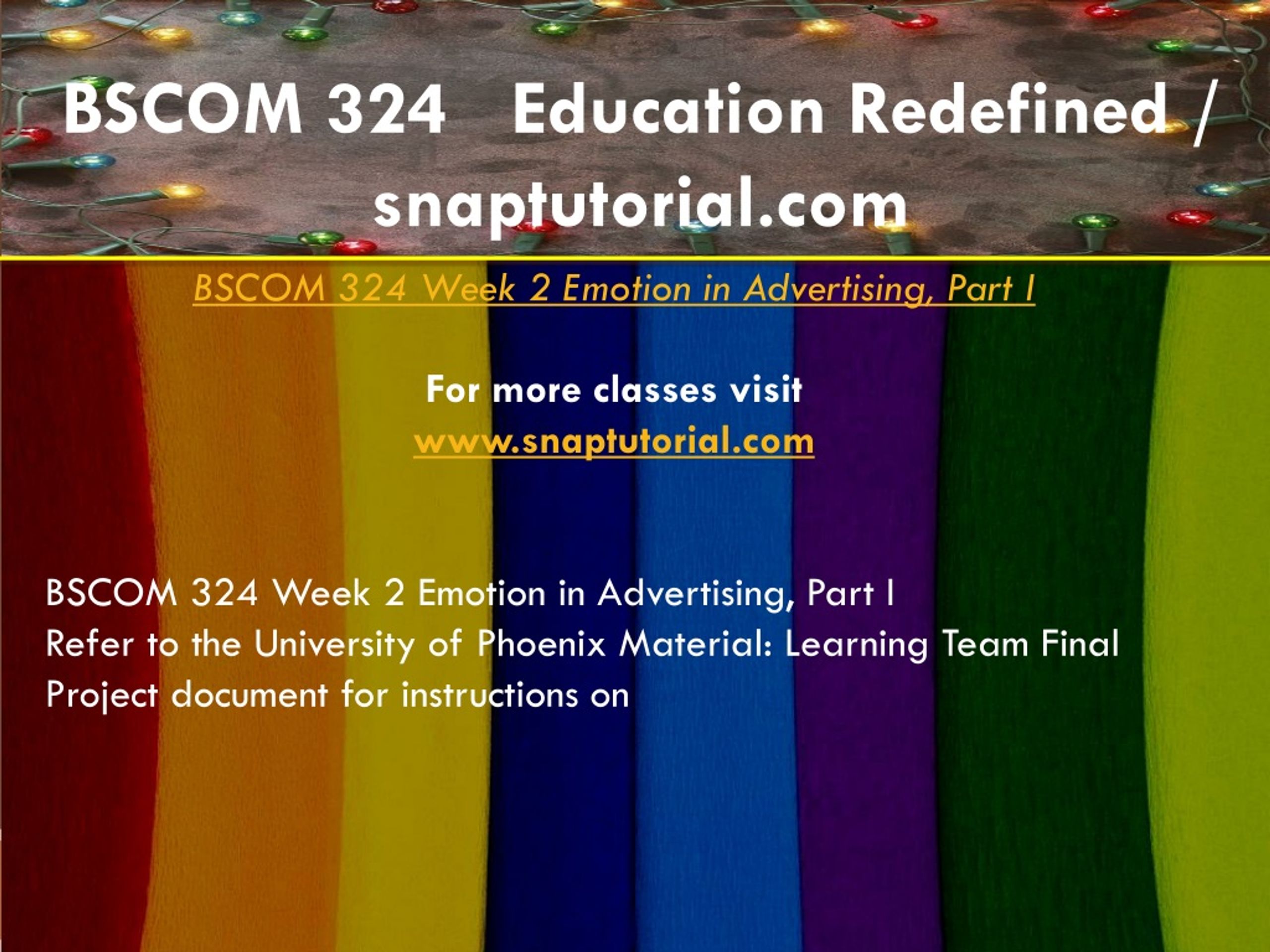 BSCOM 324 Education Redefined / snaptutorial.com BSCOM 324 Week 2 Emotion in Advertising, Part I For more classes visit www.snaptutorial.com BSCOM 324 Week 2 Emotion in Advertising, Part I Refer to the University of Phoenix Material: Learning Team Final Project document for instructions on
