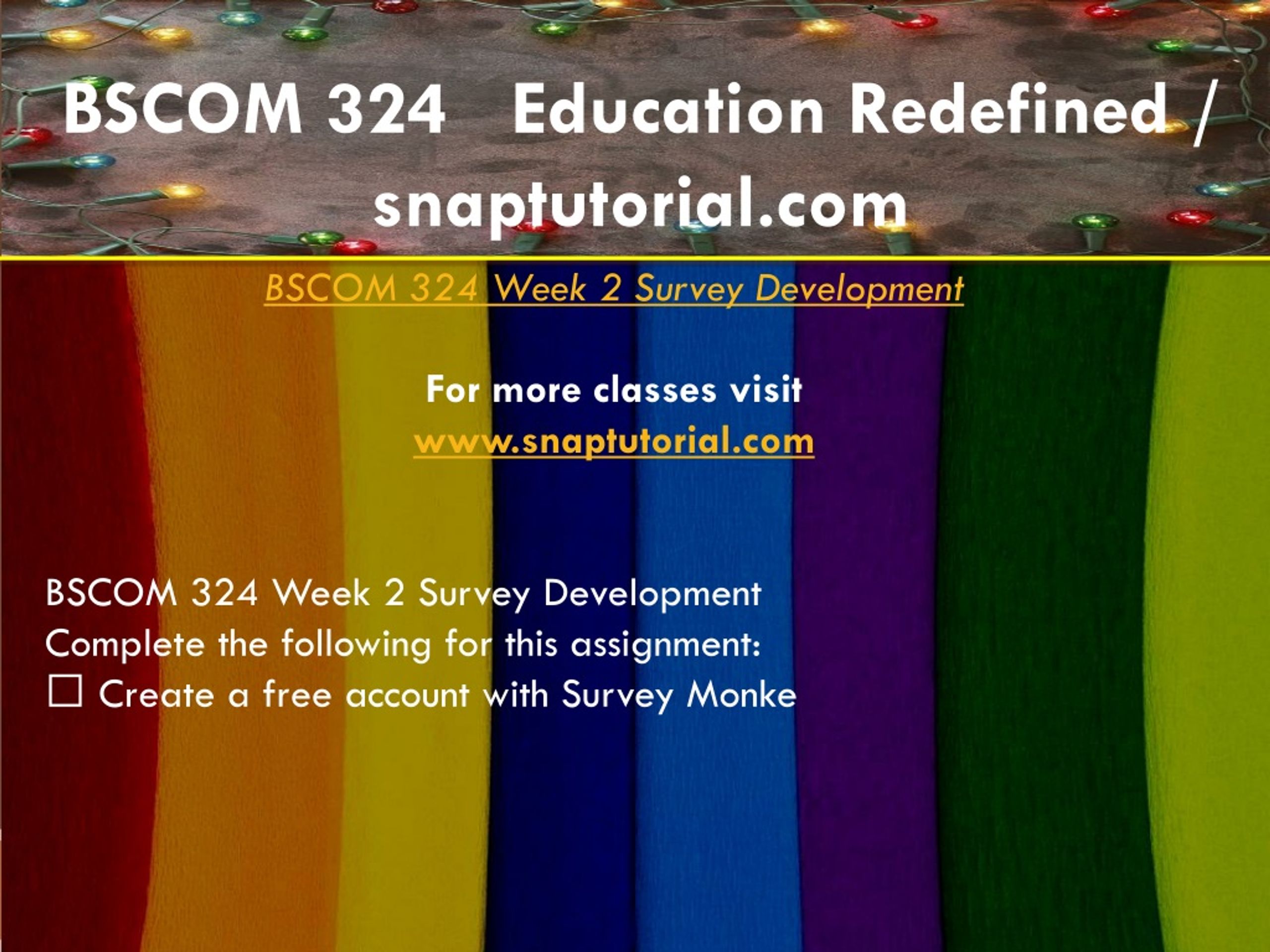 BSCOM 324 Education Redefined / snaptutorial.com BSCOM 324 Week 2 Survey Development For more classes visit www.snaptutorial.com BSCOM 324 Week 2 Survey Development Complete the following for this assignment: Create a free account with Survey Monke
