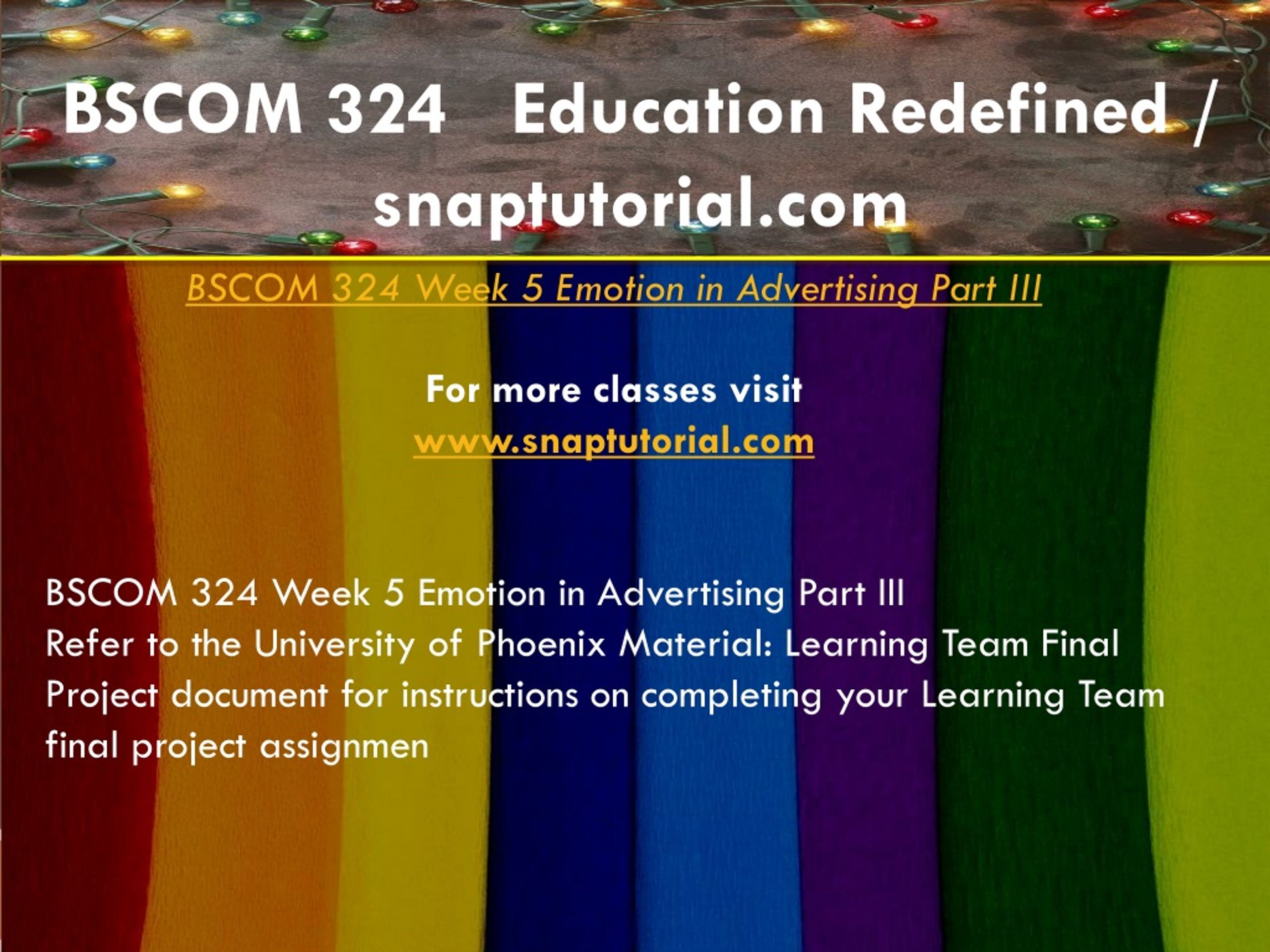 BSCOM 324 Education Redefined / snaptutorial.com BSCOM 324 Week 5 Emotion in Advertising Part III For more classes visit www.snaptutorial.com BSCOM 324 Week 5 Emotion in Advertising Part III Refer to the University of Phoenix Material: Learning Team Final Project document for instructions on completing your Learning Team final project assignmen
