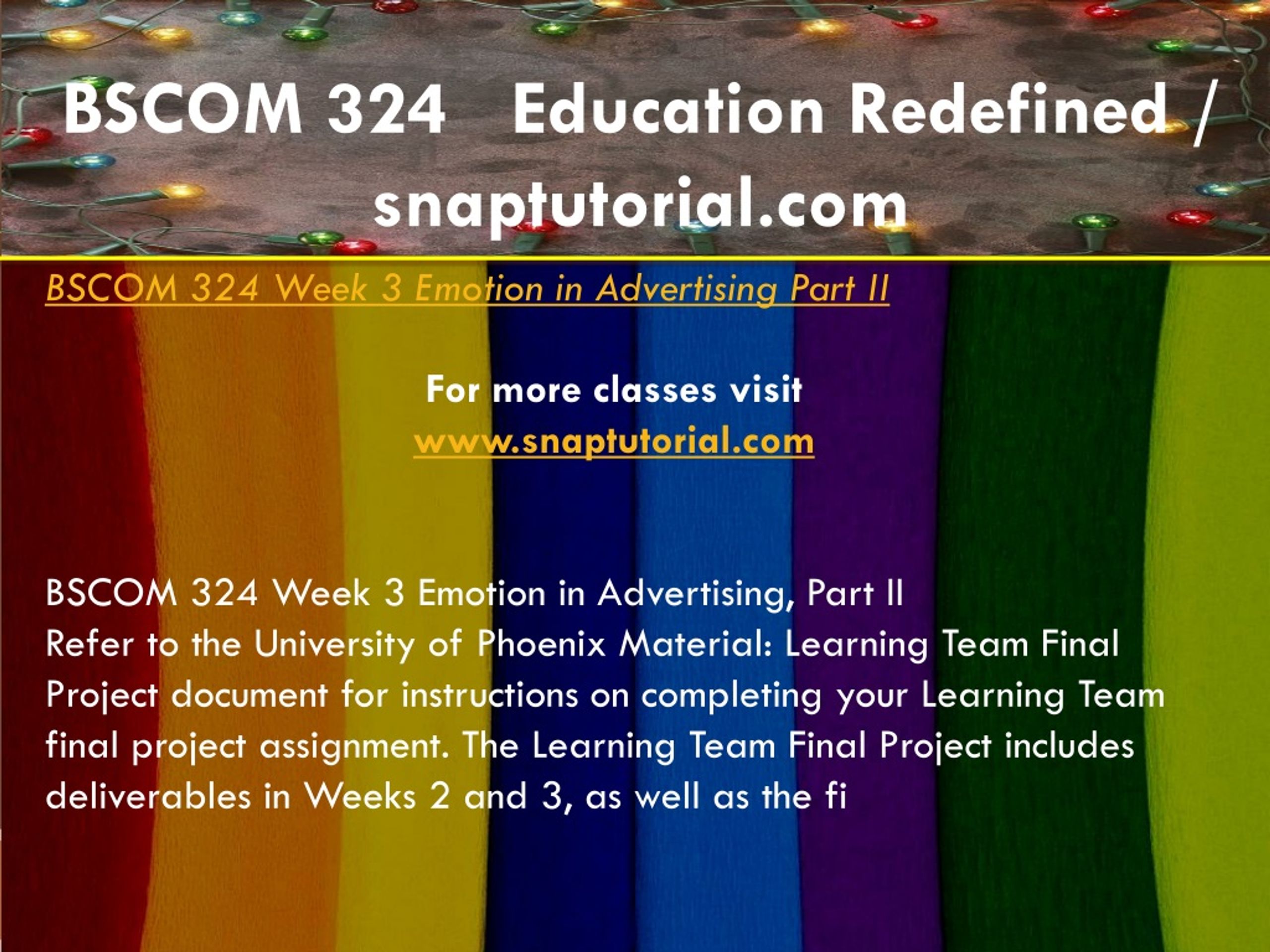 BSCOM 324 Education Redefined / snaptutorial.com BSCOM 324 Week 3 Emotion in Advertising Part II For more classes visit www.snaptutorial.com BSCOM 324 Week 3 Emotion in Advertising, Part II Refer to the University of Phoenix Material: Learning Team Final Project document for instructions on completing your Learning Team final project assignment. The Learning Team Final Project includes deliverables in Weeks 2 and 3, as well as the fi