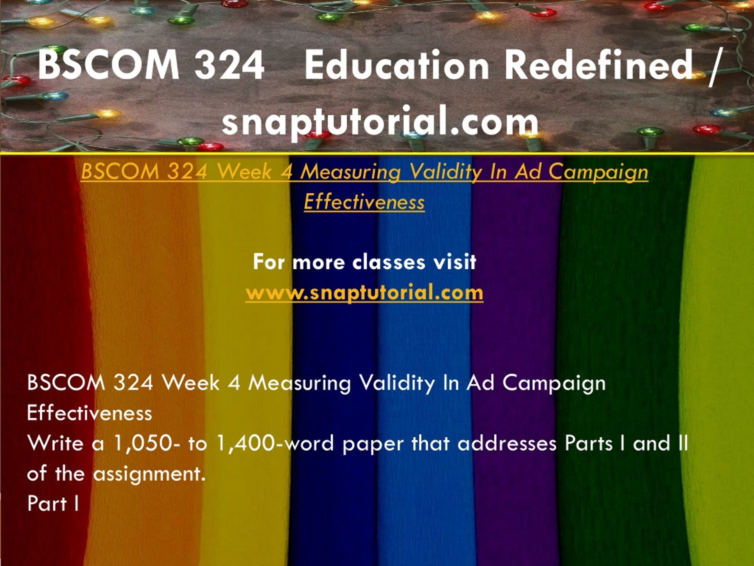 BSCOM 324 Education Redefined / snaptutorial.com BSCOM 324 Week 4 Measuring Validity In Ad Campaign Effectiveness For more classes visit www.snaptutorial.com BSCOM 324 Week 4 Measuring Validity In Ad Campaign Effectiveness Write a 1,050- to 1,400-word paper that addresses Parts I and II of the assignment. Part I