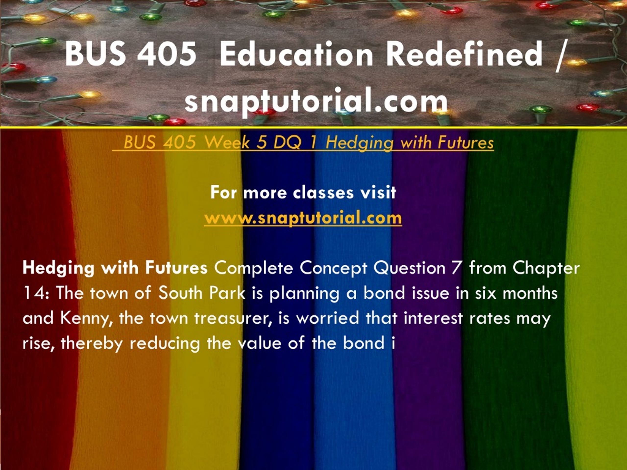 BUS 405 Education Redefined / snaptutorial.com BUS 405 Week 5 DQ 1 Hedging with Futures For more classes visit www.snaptutorial.com Hedging with Futures Complete Concept Question 7 from Chapter 14: The town of South Park is planning a bond issue in six months and Kenny, the town treasurer, is worried that interest rates may rise, thereby reducing the value of the bond i