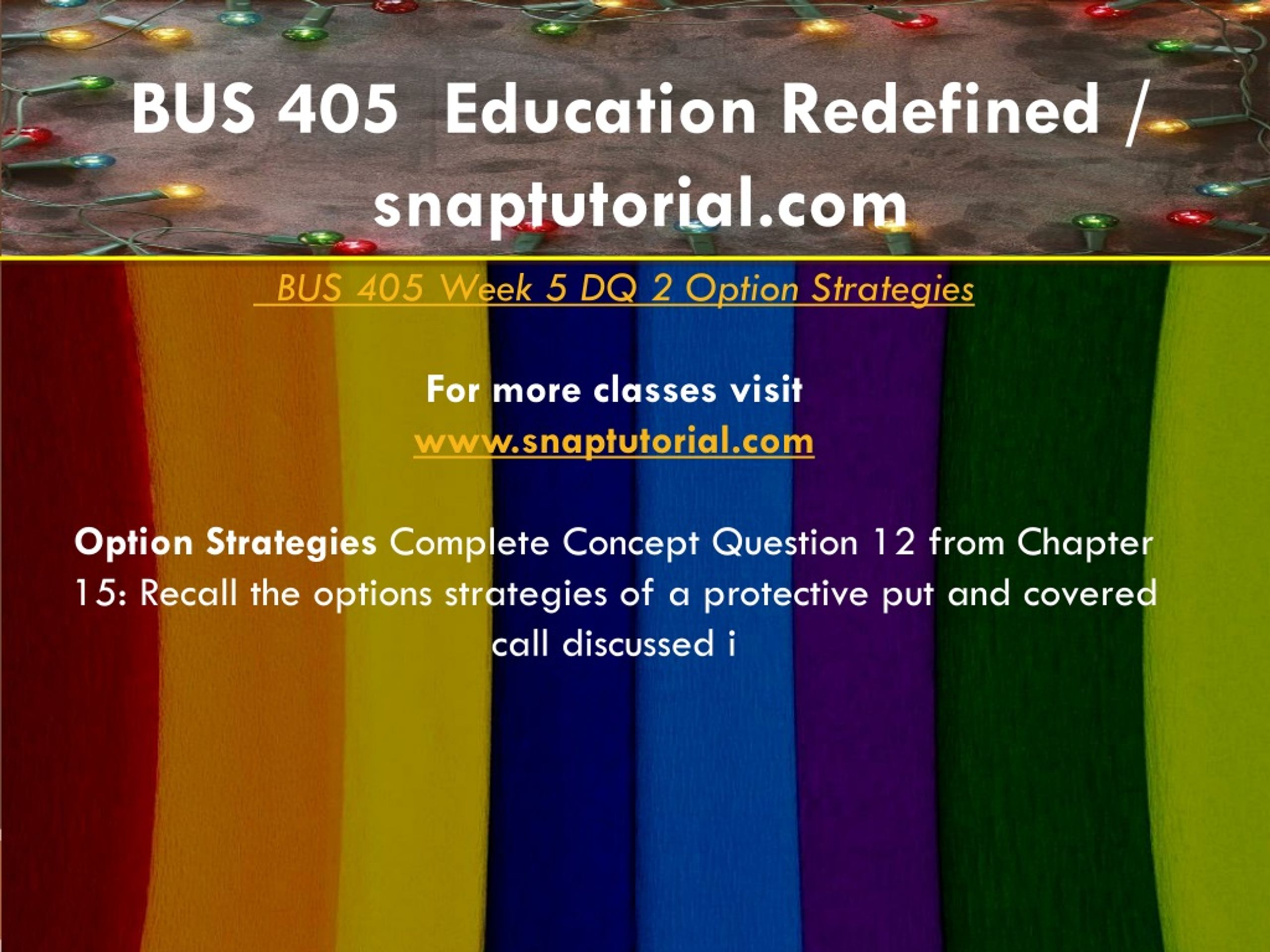 BUS 405 Education Redefined / snaptutorial.com BUS 405 Week 5 DQ 2 Option Strategies For more classes visit www.snaptutorial.com Option Strategies Complete Concept Question 12 from Chapter 15: Recall the options strategies of a protective put and covered call discussed i