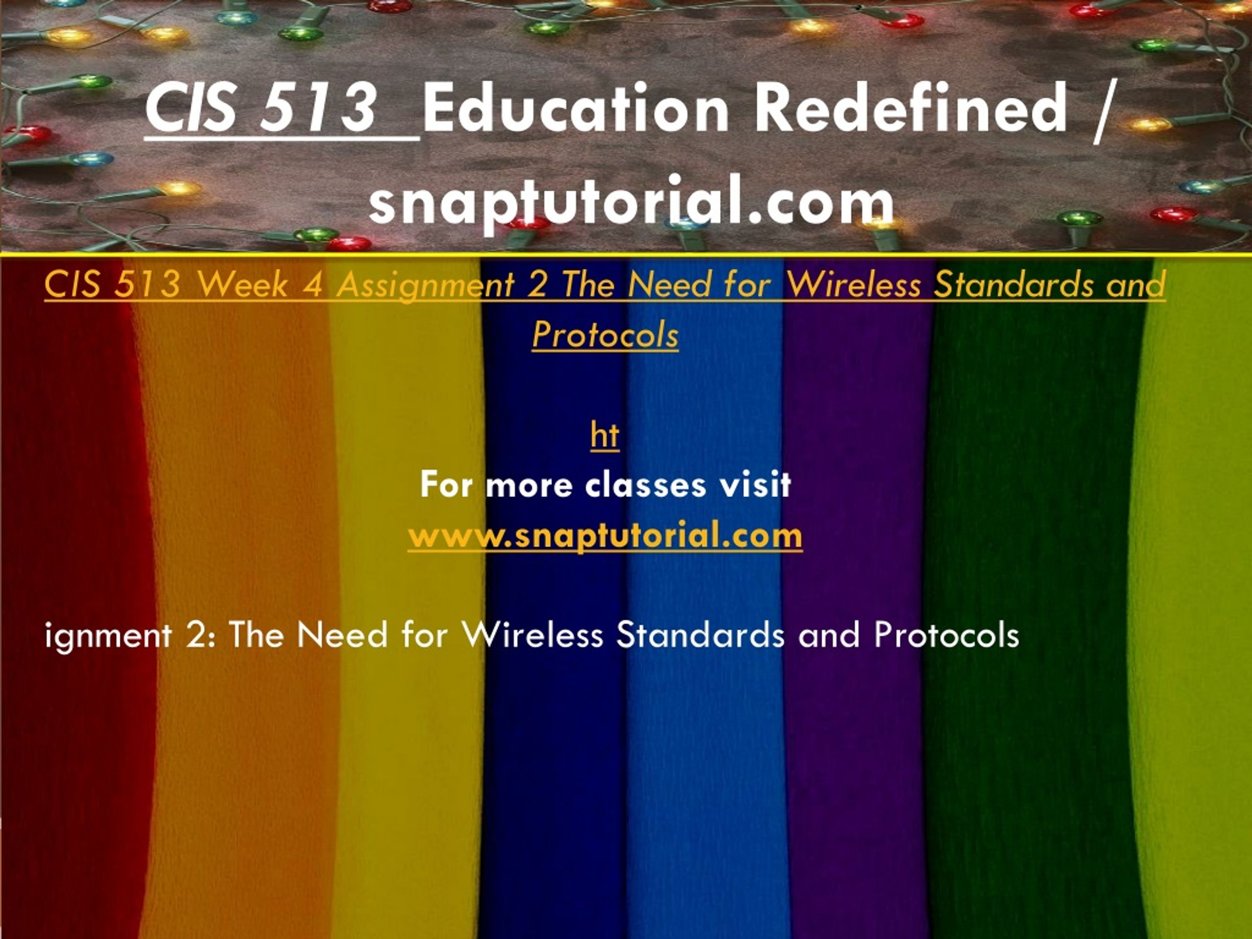 CIS 513 Education Redefined / snaptutorial.com CIS 513 Week 4 Assignment 2 The Need for Wireless Standards and Protocols ht For more classes visit www.snaptutorial.com ignment 2: The Need for Wireless Standards and Protocols