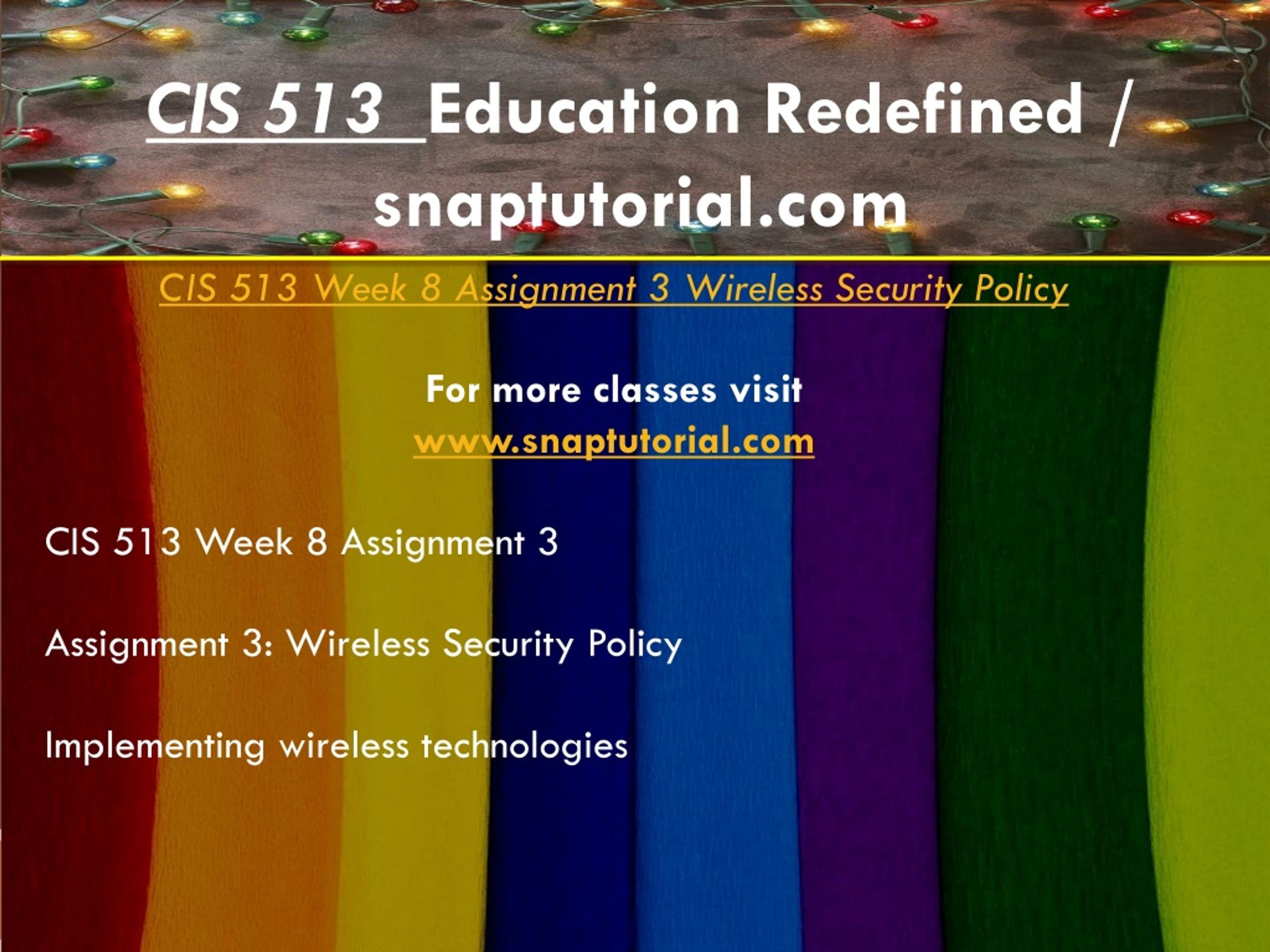 CIS 513 Education Redefined / snaptutorial.com CIS 513 Week 8 Assignment 3 Wireless Security Policy For more classes visit www.snaptutorial.com CIS 513 Week 8 Assignment 3 Assignment 3: Wireless Security Policy Implementing wireless technologies
