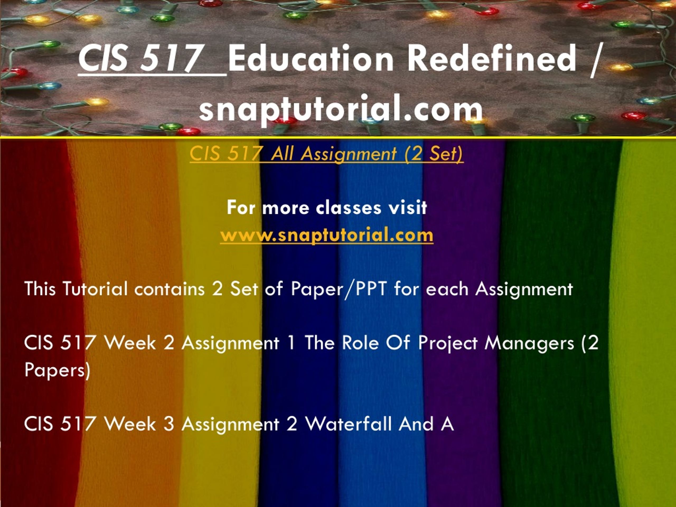 CIS 517 Education Redefined / snaptutorial.com CIS 517 All Assignment (2 Set) For more classes visit www.snaptutorial.com This Tutorial contains 2 Set of Paper/PPT for each Assignment CIS 517 Week 2 Assignment 1 The Role Of Project Managers (2 Papers) CIS 517 Week 3 Assignment 2 Waterfall And A