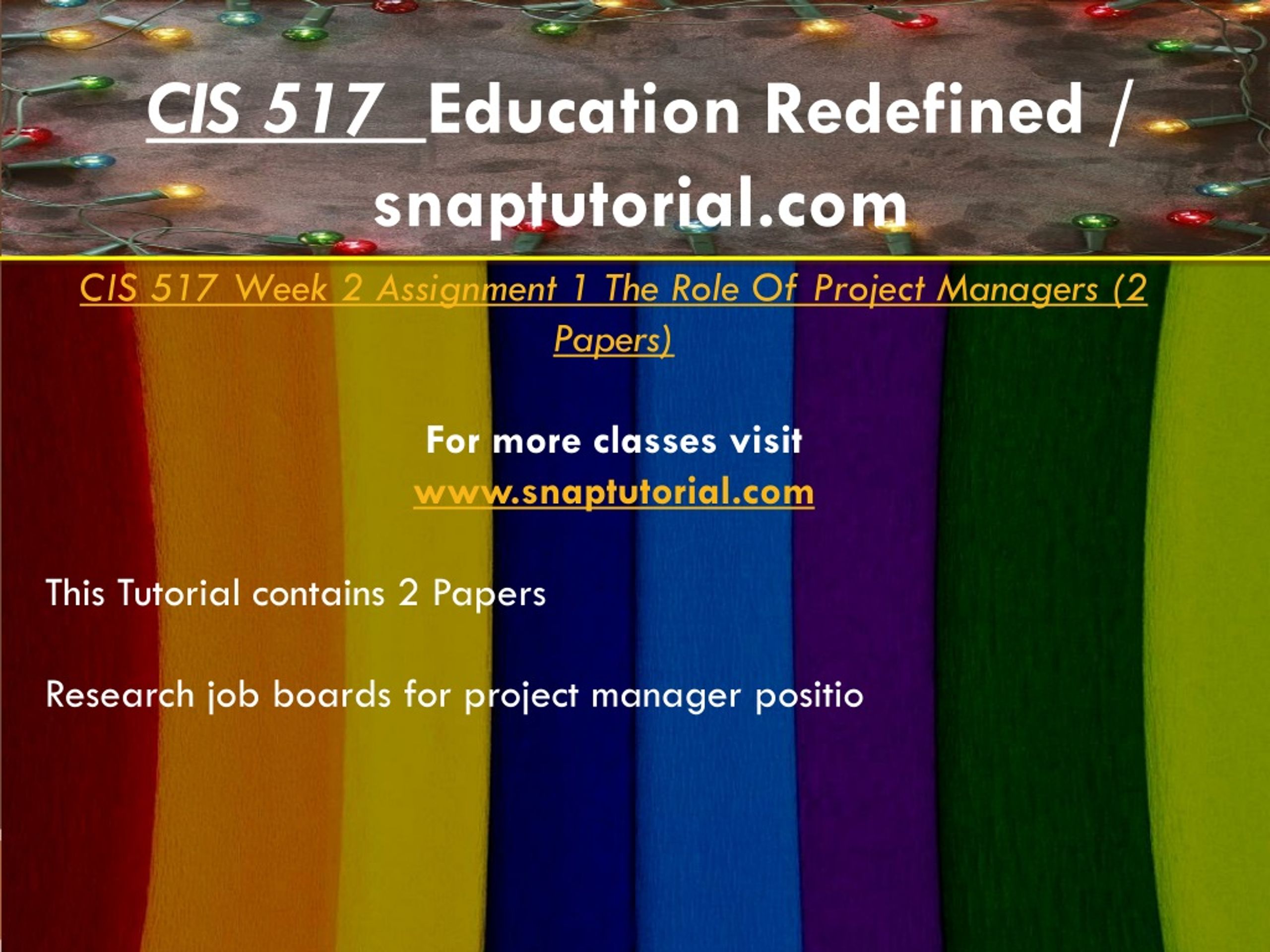 CIS 517 Education Redefined / snaptutorial.com CIS 517 Week 2 Assignment 1 The Role Of Project Managers (2 Papers) For more classes visit www.snaptutorial.com This Tutorial contains 2 Papers Research job boards for project manager positio