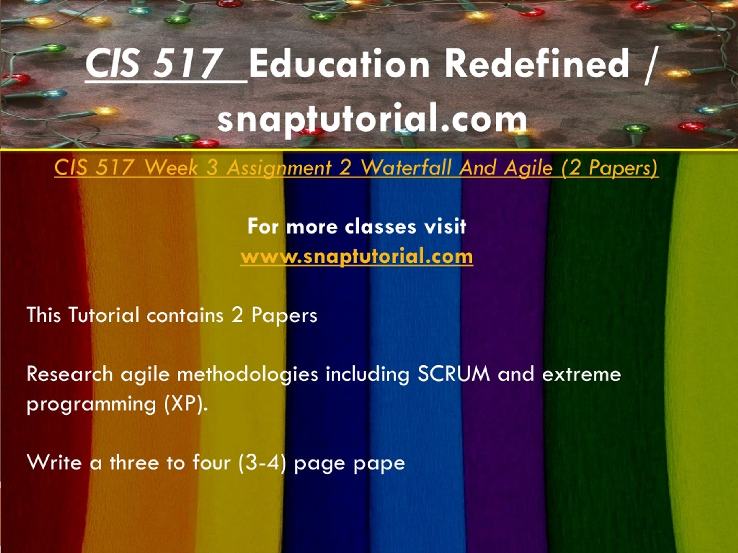 CIS 517 Education Redefined / snaptutorial.com CIS 517 Week 3 Assignment 2 Waterfall And Agile (2 Papers) For more classes visit www.snaptutorial.com This Tutorial contains 2 Papers Research agile methodologies including SCRUM and extreme programming (XP). Write a three to four (3-4) page pape