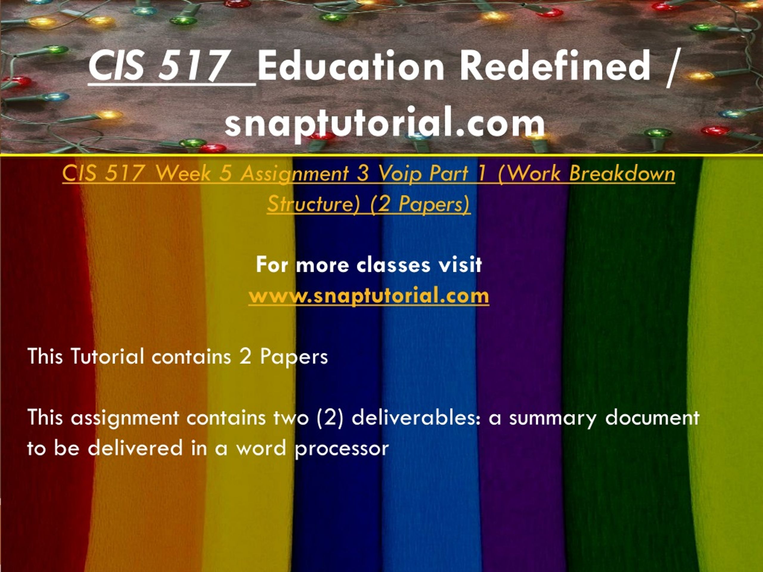 CIS 517 Education Redefined / snaptutorial.com CIS 517 Week 5 Assignment 3 Voip Part 1 (Work Breakdown Structure) (2 Papers) For more classes visit www.snaptutorial.com This Tutorial contains 2 Papers This assignment contains two (2) deliverables: a summary document to be delivered in a word processor