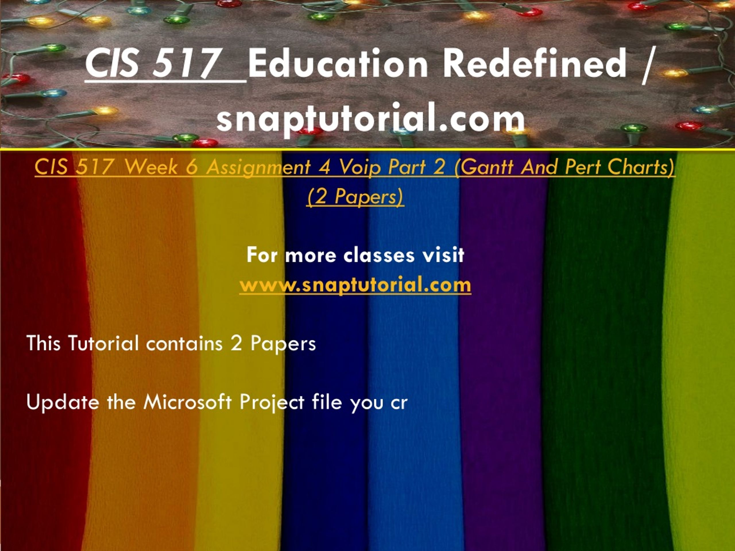 CIS 517 Education Redefined / snaptutorial.com CIS 517 Week 6 Assignment 4 Voip Part 2 (Gantt And Pert Charts) (2 Papers) For more classes visit www.snaptutorial.com This Tutorial contains 2 Papers Update the Microsoft Project file you cr
