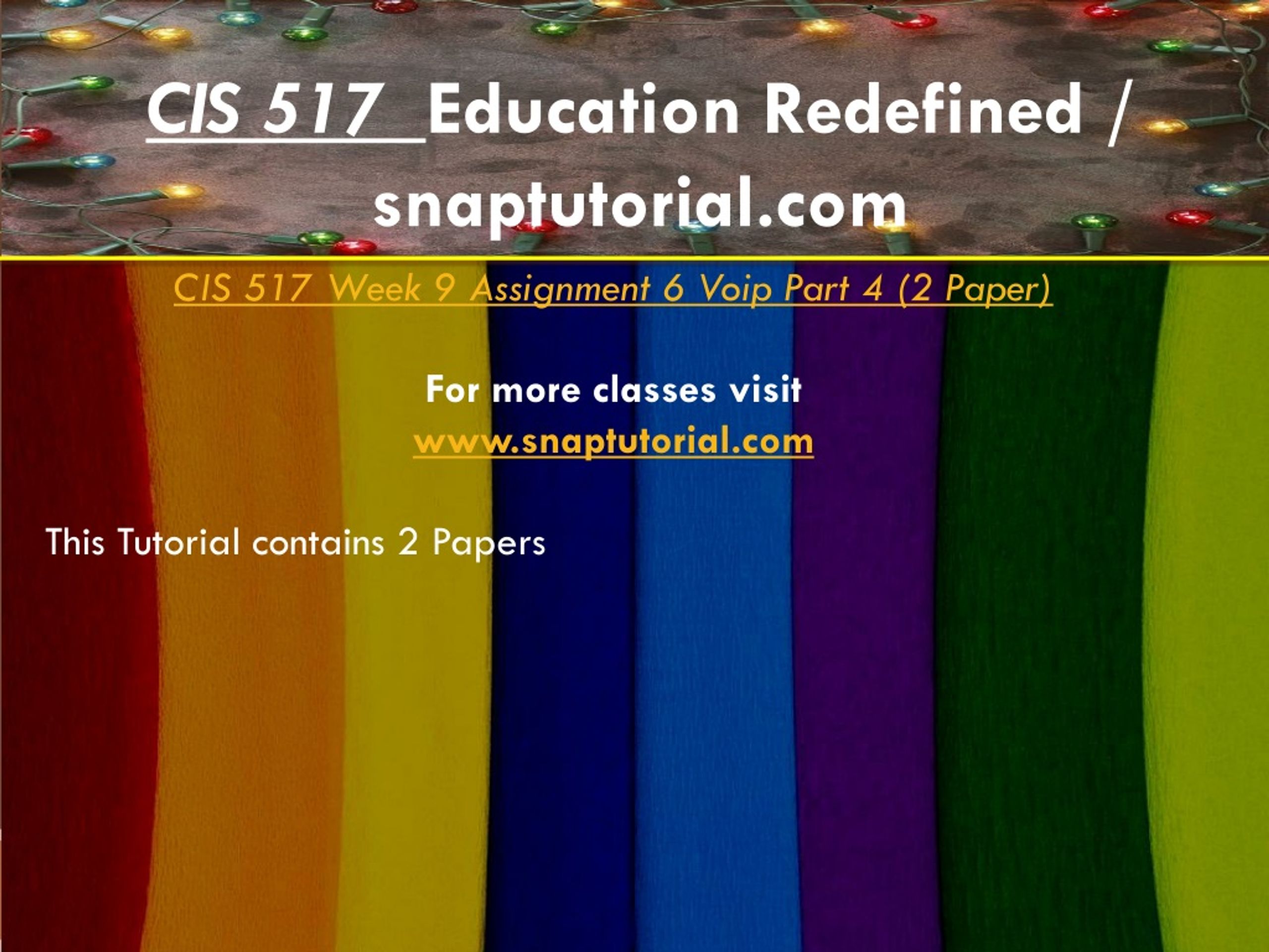 CIS 517 Education Redefined / snaptutorial.com CIS 517 Week 8 Assignment 5 Voip Part 3 (Quality) (2 PPT) For more classes visit www.snaptutorial.com This Tutorial contains 2 Papers