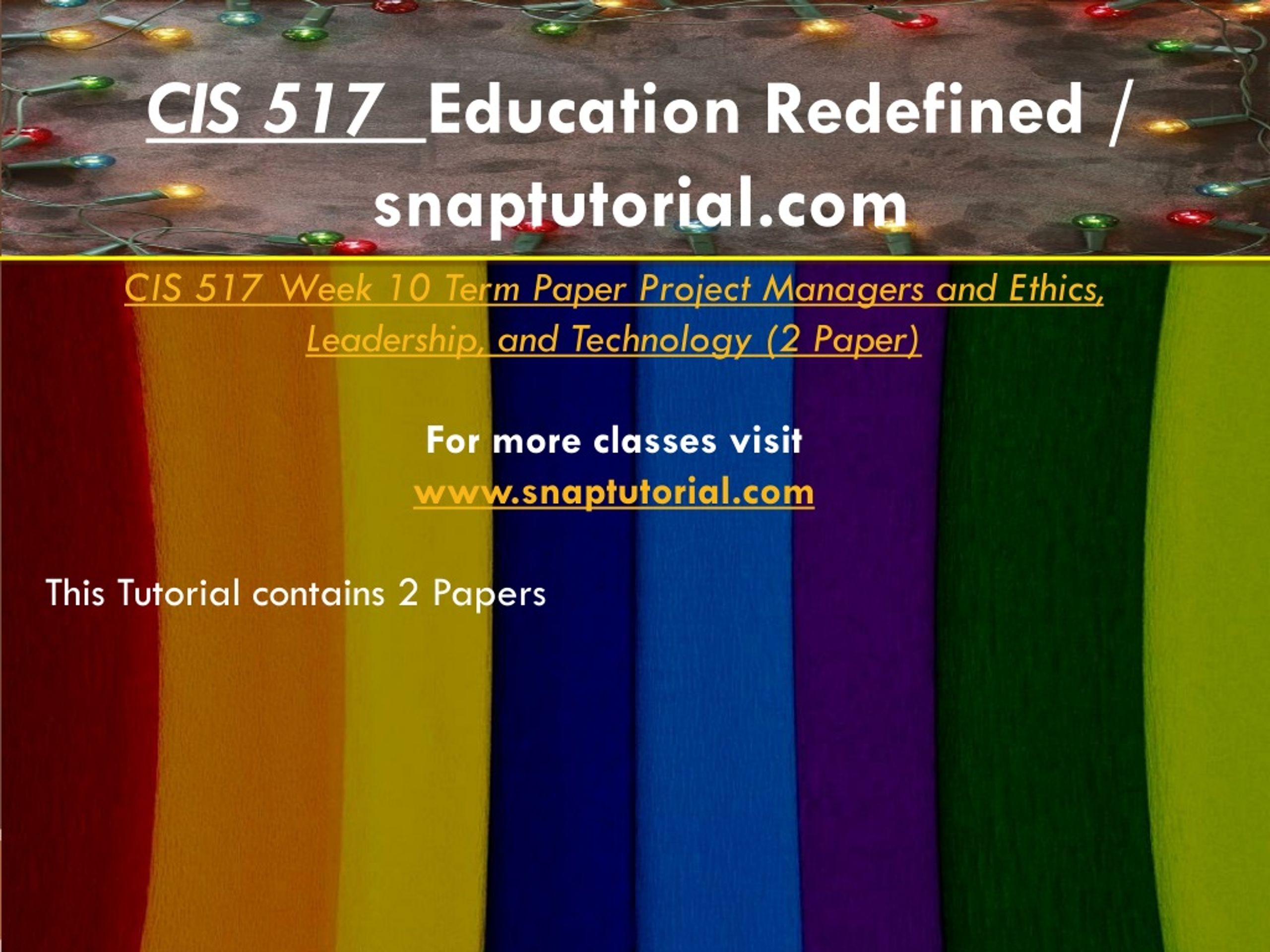 CIS 517 Education Redefined / snaptutorial.com CIS 517 Week 10 Term Paper Project Managers and Ethics, Leadership, and Technology (2 Paper) For more classes visit www.snaptutorial.com This Tutorial contains 2 Papers