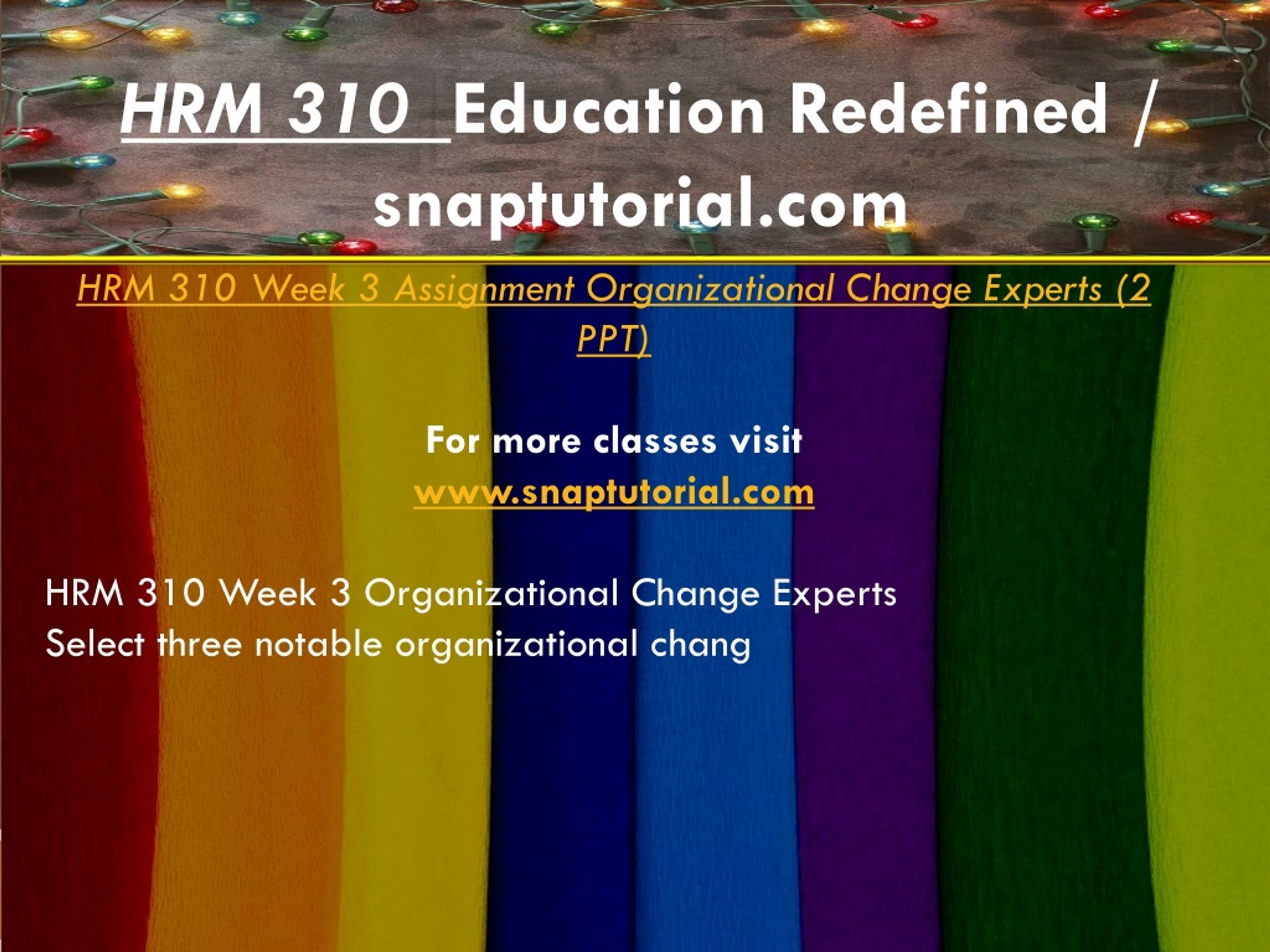 HRM 310 Education Redefined / snaptutorial.com HRM 310 Week 3 Assignment Organizational Change Experts (2 PPT) For more classes visit www.snaptutorial.com HRM 310 Week 3 Organizational Change Experts Select three notable organizational chang