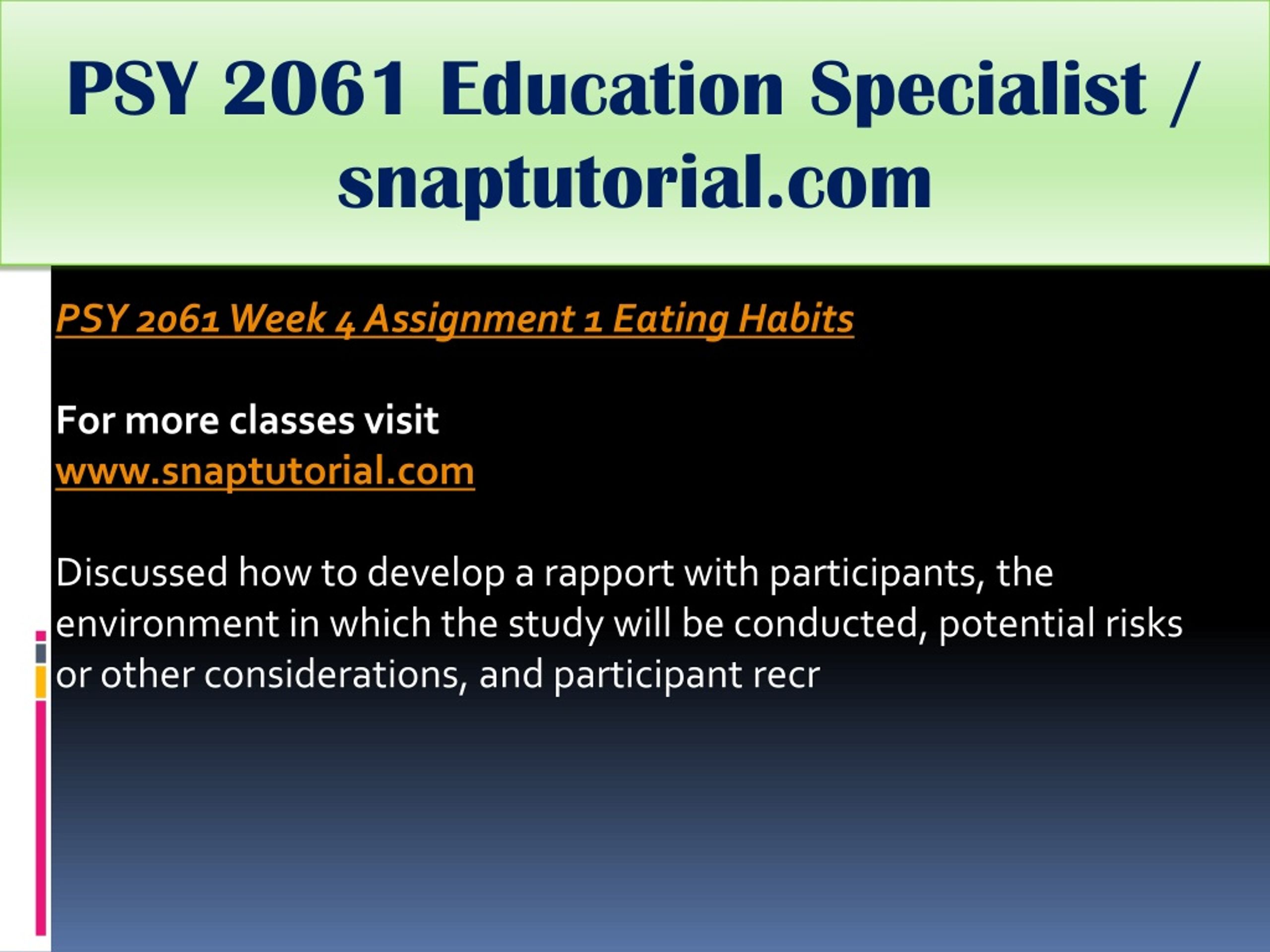 PSY 2061 Education Specialist / snaptutorial.com PSY 2061 Week 4 Assignment 1 Eating Habits For more classes visit www.snaptutorial.com Discussed how to develop a rapport with participants, the environment in which the study will be conducted, potential risks or other considerations, and participant recr