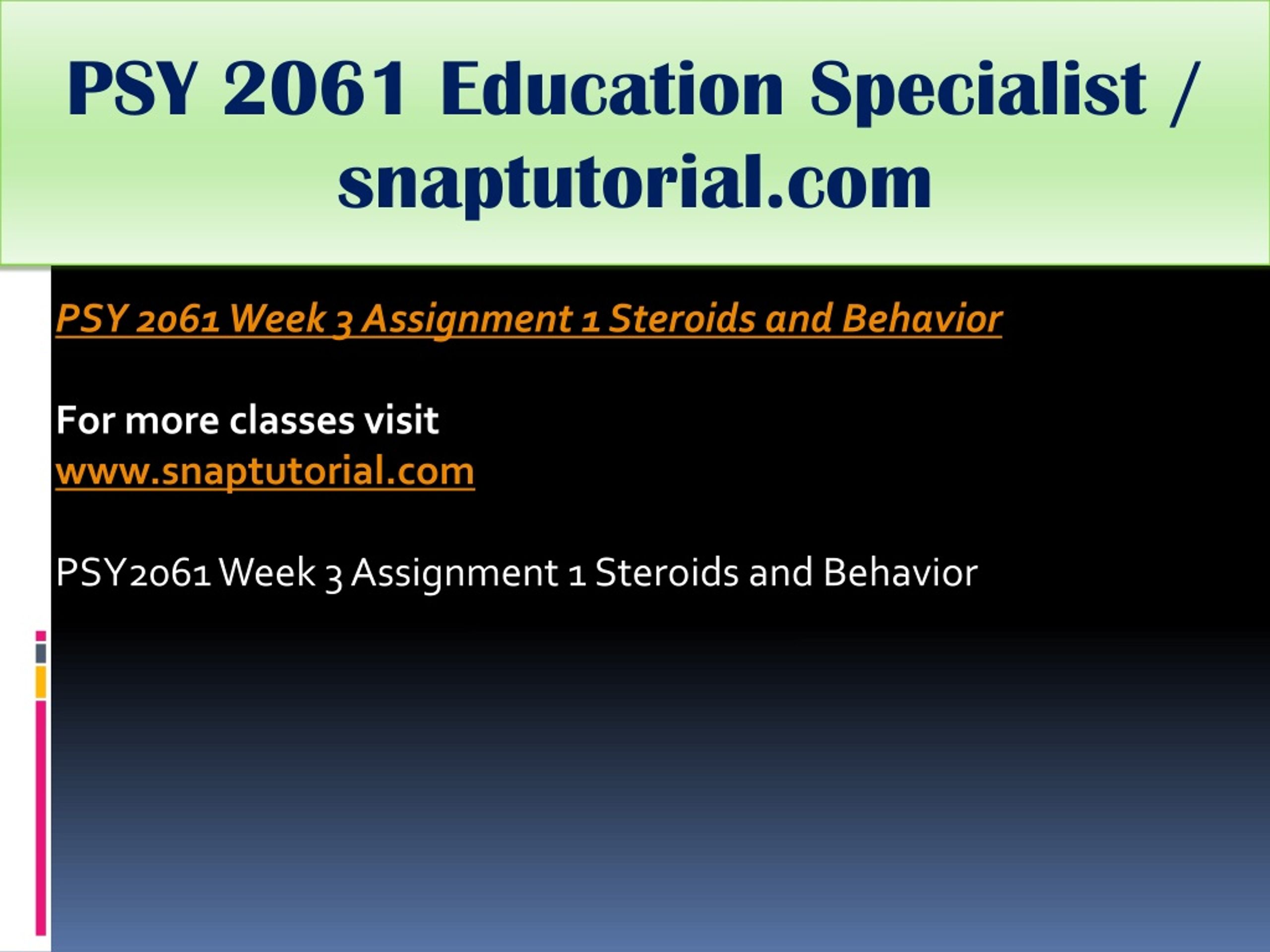 PSY 2061 Education Specialist / snaptutorial.com PSY 2061 Week 3 Assignment 1 Steroids and Behavior For more classes visit www.snaptutorial.com PSY2061 Week 3 Assignment 1 Steroids and Behavior