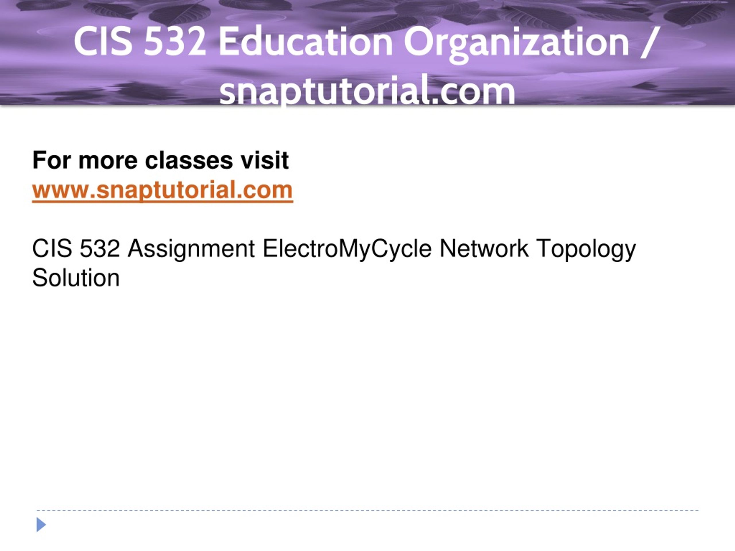 CIS 532 Education Organization / snaptutorial.com • For more classes visit • www.snaptutorial.com • CIS 532 Assignment ElectroMyCycle Network Topology Solution
