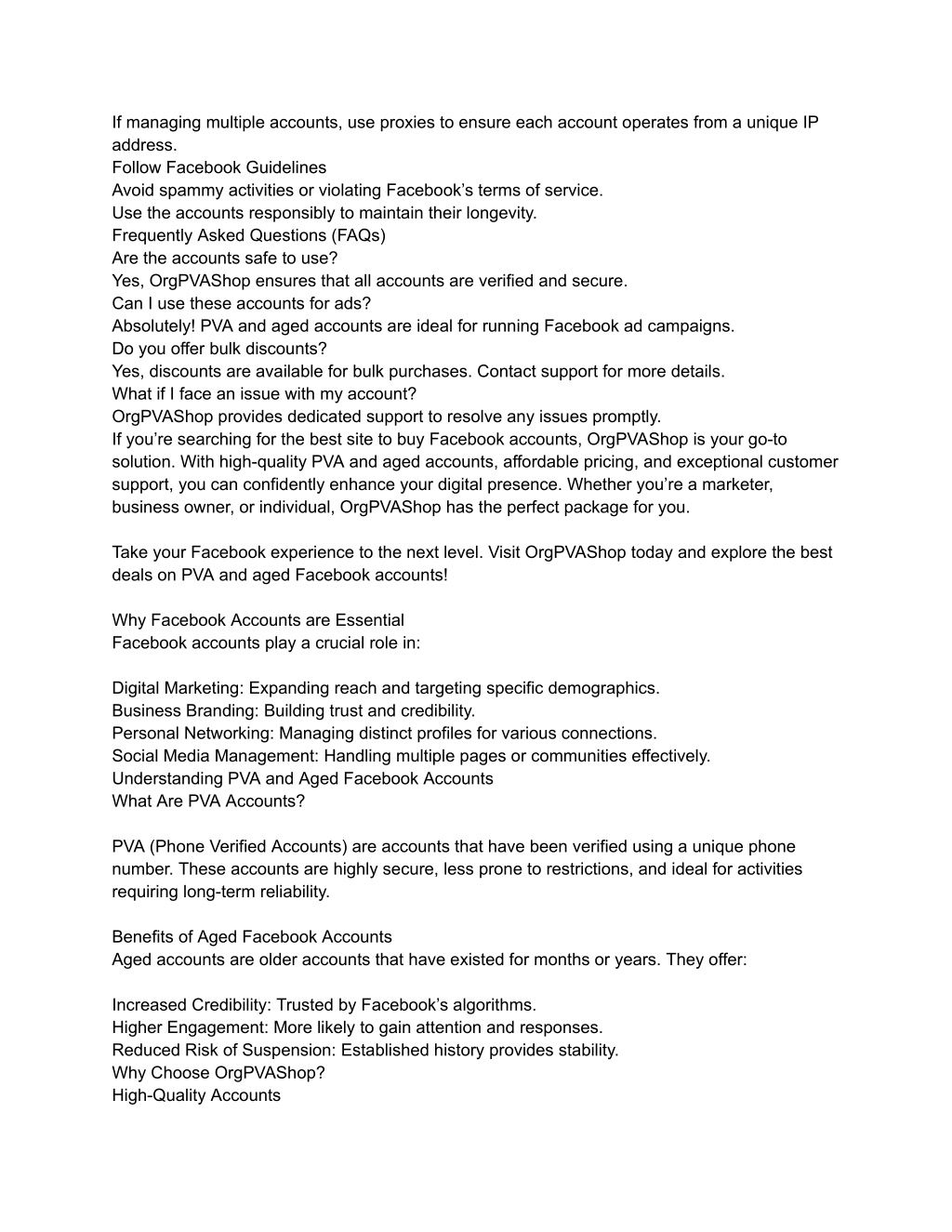If managing multiple accounts, use proxies to ensure each account operates from a unique IP address. Follow Facebook Guidelines Avoid spammy activities or violating Facebook’s terms of service. Use the accounts responsibly to maintain their longevity. Frequently Asked Questions (FAQs) Are the accounts safe to use? Yes, OrgPVAShop ensures that all accounts are verified and secure. Can I use these accounts for ads? Absolutely! PVA and aged accounts are ideal for running Facebook ad campaigns. Do you offer bulk discounts? Yes, discounts are available for bulk purchases. Contact support for more details. What if I face an issue with my account? OrgPVAShop provides dedicated support to resolve any issues promptly. If you’re searching for the best site to buy Facebook accounts, OrgPVAShop is your go-to solution. With high-quality PVA and aged accounts, affordable pricing, and exceptional customer support, you can confidently enhance your digital presence. Whether you’re a marketer, business owner, or individual, OrgPVAShop has the perfect package for you. Take your Facebook experience to the next level. Visit OrgPVAShop today and explore the best deals on PVA and aged Facebook accounts! Why Facebook Accounts are Essential Facebook accounts play a crucial role in: Digital Marketing: Expanding reach and targeting specific demographics. Business Branding: Building trust and credibility. Personal Networking: Managing distinct profiles for various connections. Social Media Management: Handling multiple pages or communities effectively. Understanding PVA and Aged Facebook Accounts What Are PVA Accounts? PVA (Phone Verified Accounts) are accounts that have been verified using a unique phone number. These accounts are highly secure, less prone to restrictions, and ideal for activities requiring long-term reliability. Benefits of Aged Facebook Accounts Aged accounts are older accounts that have existed for months or years. They offer: Increased Credibility: Trusted by Facebook’s algorithms. Higher Engagement: More likely to gain attention and responses. Reduced Risk of Suspension: Established history provides stability. Why Choose OrgPVAShop? High-Quality Accounts