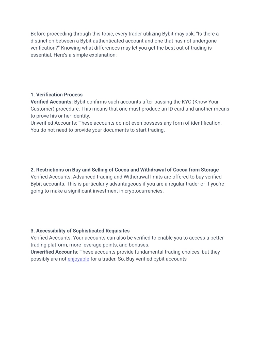 Before proceeding through this topic, every trader utilizing Bybit may ask: “Is there a distinction between a Bybit authenticated account and one that has not undergone verification?” Knowing what differences may let you get the best out of trading is essential. Here’s a simple explanation: 1. Verification Process Verified Accounts: Bybit confirms such accounts after passing the KYC (Know Your Customer) procedure. This means that one must produce an ID card and another means to prove his or her identity. Unverified Accounts: These accounts do not even possess any form of identification. You do not need to provide your documents to start trading. 2. Restrictions on Buy and Selling of Cocoa and Withdrawal of Cocoa from Storage Verified Accounts: Advanced trading and Withdrawal limits are offered to buy verified Bybit accounts. This is particularly advantageous if you are a regular trader or if you’re going to make a significant investment in cryptocurrencies. 3. Accessibility of Sophisticated Requisites Verified Accounts: Your accounts can also be verified to enable you to access a better trading platform, more leverage points, and bonuses. Unverified Accounts: These accounts provide fundamental trading choices, but they possibly are not enjoyable for a trader. So, Buy verified bybit accounts