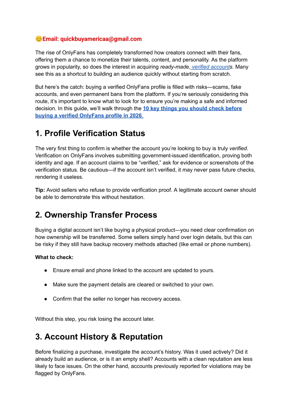In the world of digital account transactions, scams are everywhere. Some sellers may promise a verified account but disappear after payment. Always check the reputation of the source. Ways to research sellers: ● Look for established platforms with buyer protection. ● Read reviews and testimonials. ● Avoid new or anonymous sellers with no history. 10. Long-Term Sustainability Even if you successfully buy a verified OnlyFans profile, think about long-term sustainability. Will the account remain safe in the future? Can you continue posting without raising suspicions? Will fans remain engaged once they notice a content style change? Buying an account might give you a quick start, but unless you can maintain and grow the community, the investment may not pay off. Conclusion ?Telegram: @quickbuyamerica ?Email: quickbuyamericaa@gmail.com Buying a verified OnlyFans profile in 2026 might seem like a shortcut to success, but it comes with significant risks—both financial and legal. If you do choose this route, always ensure you check these10 key factors: verification, ownership transfer, history, engagement, payment info, legal risks, identity consistency, content rights, seller reputation, and long-term sustainability. At the end of the day, the safest approach is still to create and verify your own OnlyFans account. It not only ensures compliance with platform rules but also gives you complete control over your brand, audience, and content. 10 Key Things to Check Before Buying a Verified OnlyFans Profile Introduction ?Telegram: @quickbuyamerica